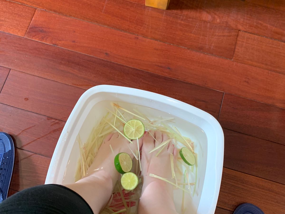最初にレモングラスが入った足湯で塩で足を洗ってくれました。
