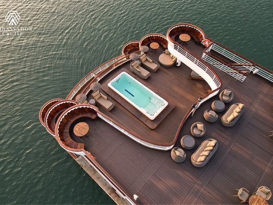 ハロン湾最大級の豪華客船「アンバサダー号」。屋外ジャグジープール、エレガントなデザインのレストラン、ピアノラウンジ等を備え、特別な大人旅にぴったりのクルーズです。