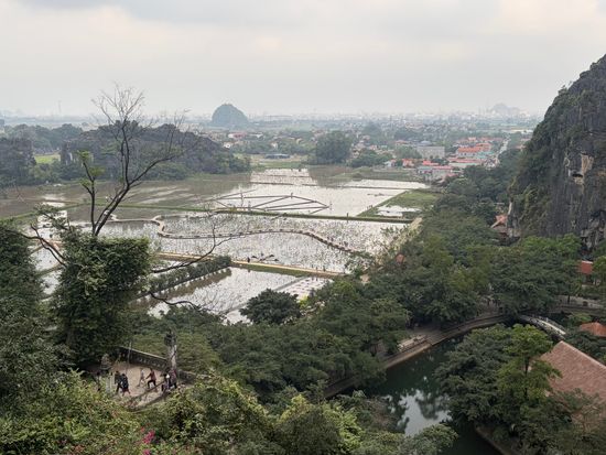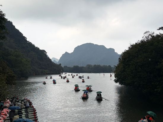 約500段の急な階段を登り頂上へたどり着くと、小舟が並んでいるタムコック川の美しい景色やニンビンの奇岩が連なる景色など、息をのむような空間が広がっています。頂上まで行くにはかなり体力を使いますが、その分美しい景色を眺めることができます。