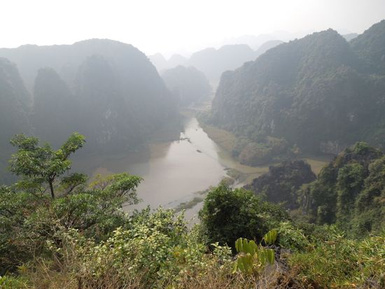 約500段の急な階段を登り頂上へたどり着くと、小舟が並んでいるタムコック川の美しい景色やニンビンの奇岩が連なる景色など、息をのむような空間が広がっています。頂上まで行くにはかなり体力を使いますが、その分美しい景色を眺めることができます。