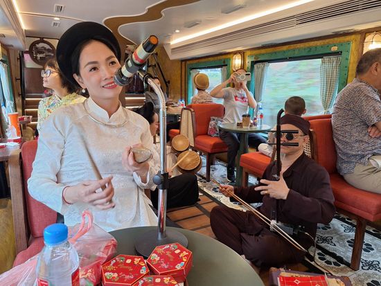 内装がそれぞれ異なるテーマで装飾された、2階建て10両編成の観光列車「ハノイ・トレイン」。約40分の乗車中には、伝統音楽や舞踊のパフォーマンスに加え、民俗絵画「ドンホー」や幸福を象徴する伝統菓子「プーテー」の制作体験、さらに蓮茶や若いもち米を使った軽食も味わえるなど、ハノイの多彩な文化に触れられます。