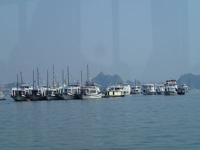 私は、一人参加でしたが、ほかに11名の日本人の方が参加していらっしゃって、マイクロバス1台でハロン湾まで行きました。マイクロバスはちょっと狭かったですが、ほかの参加者の方もガイドさんもよい方で、とても楽しく過ごせました。ハロン湾の水上村はすでに残骸だけになってましたが、ぎりぎり残骸を見れただけでも良かったです。また、天気にも恵まれて、船から見る景色は最高でした。書入道も幻想的で素晴らしかったです。ただ、お食事と船のお手洗いは、残念だった気がしないでも。。。船は英語のお客様と一緒でした。ちょっと驚いたのは、船がたくさんありほかの船と普通に衝突してることで、帰りは無理無理港に着くべくほんのちょっとの隙間を自分の船体でぐりぐり押し広げてたらお隣の船の窓が開いてたのでそれに引っ掛けてその窓は飛び散りました。日本だったらありえない光景ですが、何事もなかったかのように事が済んでい行くところもある意味感動でした。