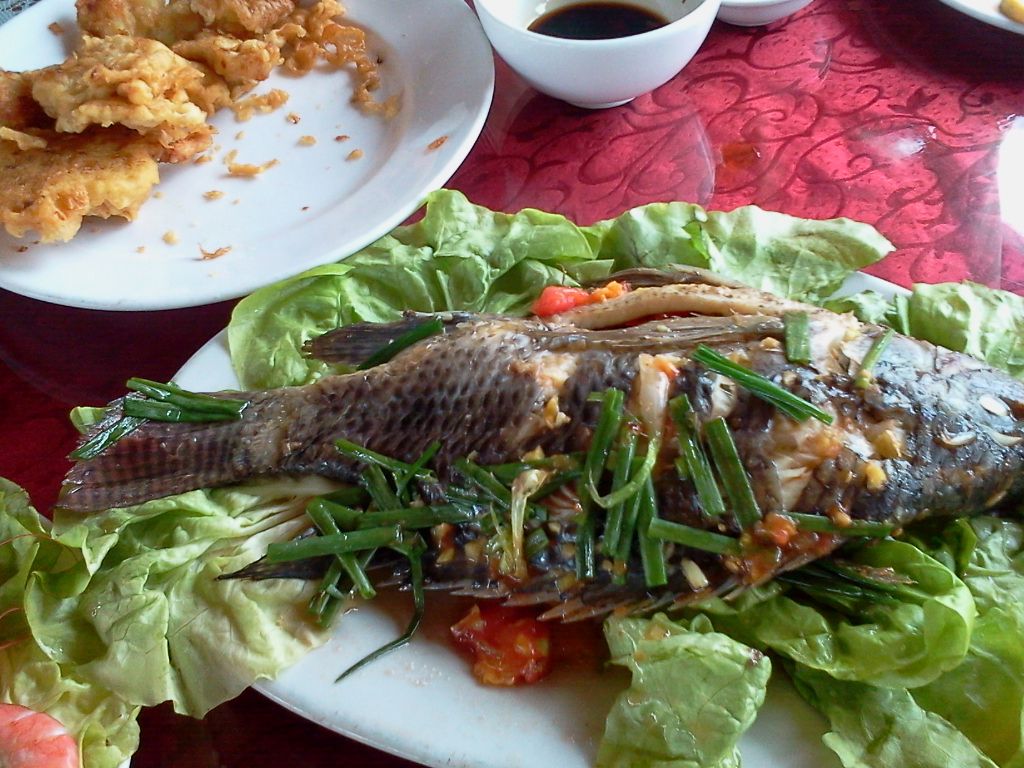 船内の食事は美味しい。海老・浅蜊の蒸し物、蟹、春巻き、スープ、野菜炒め、果物等。特に野菜のガーリック炒めは美味しかった。大きなシャコが$5/1匹で、2個で$10。ガイドさんは蟹や果物を買おうとした際、既に食事の中に含まれていることを伝えてくれるなど親切。
