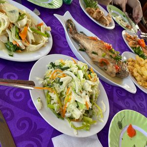 船上でのランチは蒸しエビ、魚のソテー、シーフード春巻き、イカのガーリック炒め、野菜炒め、蒸しハマグリ、ライス、フルーツ等です。世界遺産の大自然の中で食べると味も格別でした。