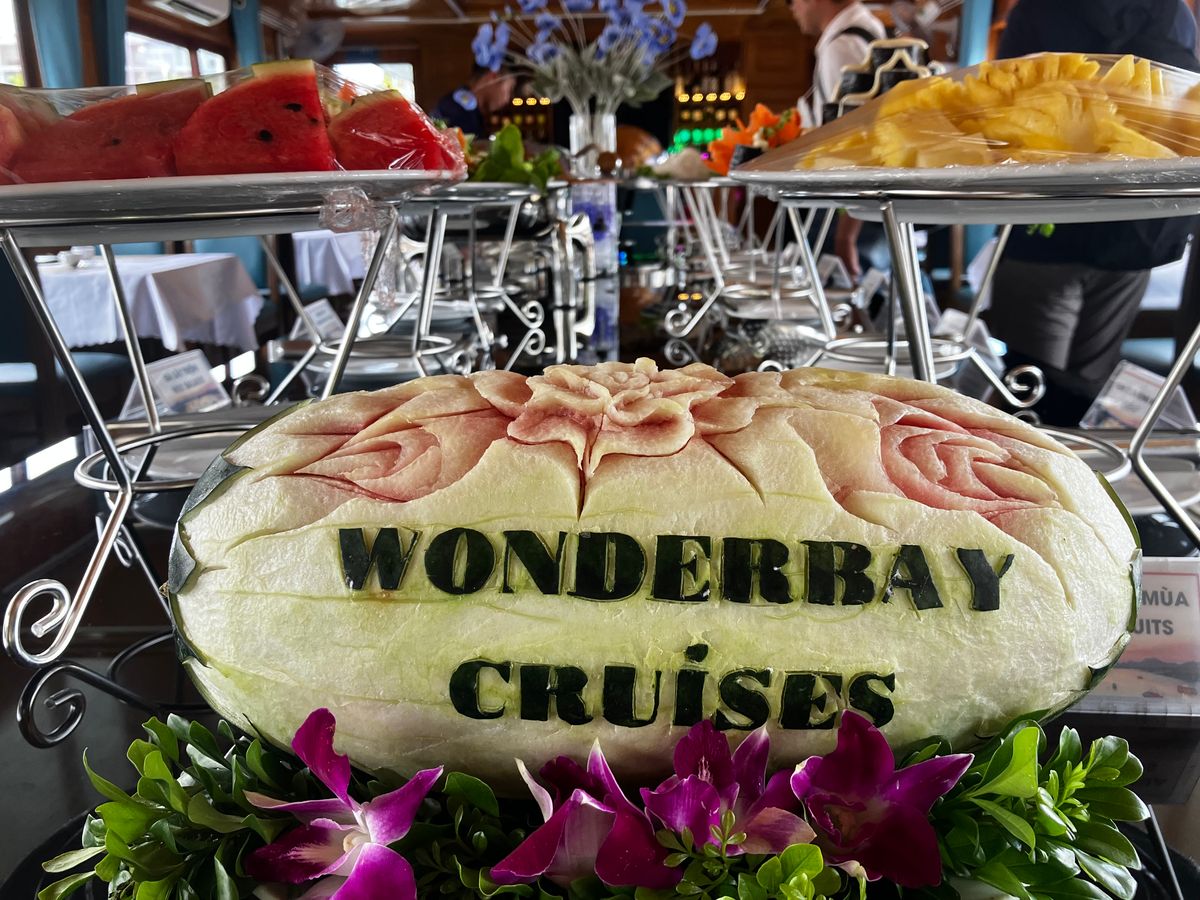 1日中盛りだくさんで楽しいツアーだったのですが、最後のパーティーなるものは、必ずしもサンセットが見られるわけではないし、出るのはお菓子とフルーツだけなので、要らないかなと思います。その分、早く帰ればハノイ市内で夕食をゆっくりとれますので。