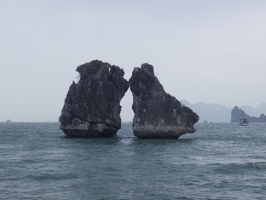 ハロン湾には2000以上の島があり最初に見るのが最も小さい島でお札の絵柄に採用されている。次がもっとも有名なキッス島?、裏に回ると魚岩に。