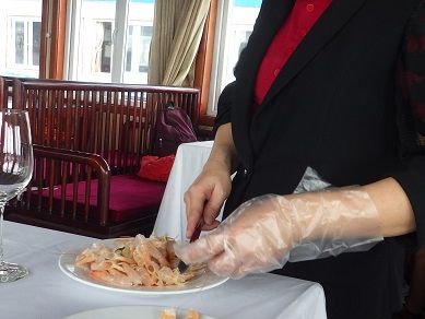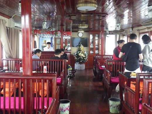 船内はレストラン仕様で乗船後すぐ、鍾乳洞へ着くまでの間昼食が出ました。ベトナム料理のコース。料理の数は6品とスープとご飯(ジャポニカ米)。ベトナムでは料理によってコメ(ジャポニカ米とインディカ米)が使い分けられている。