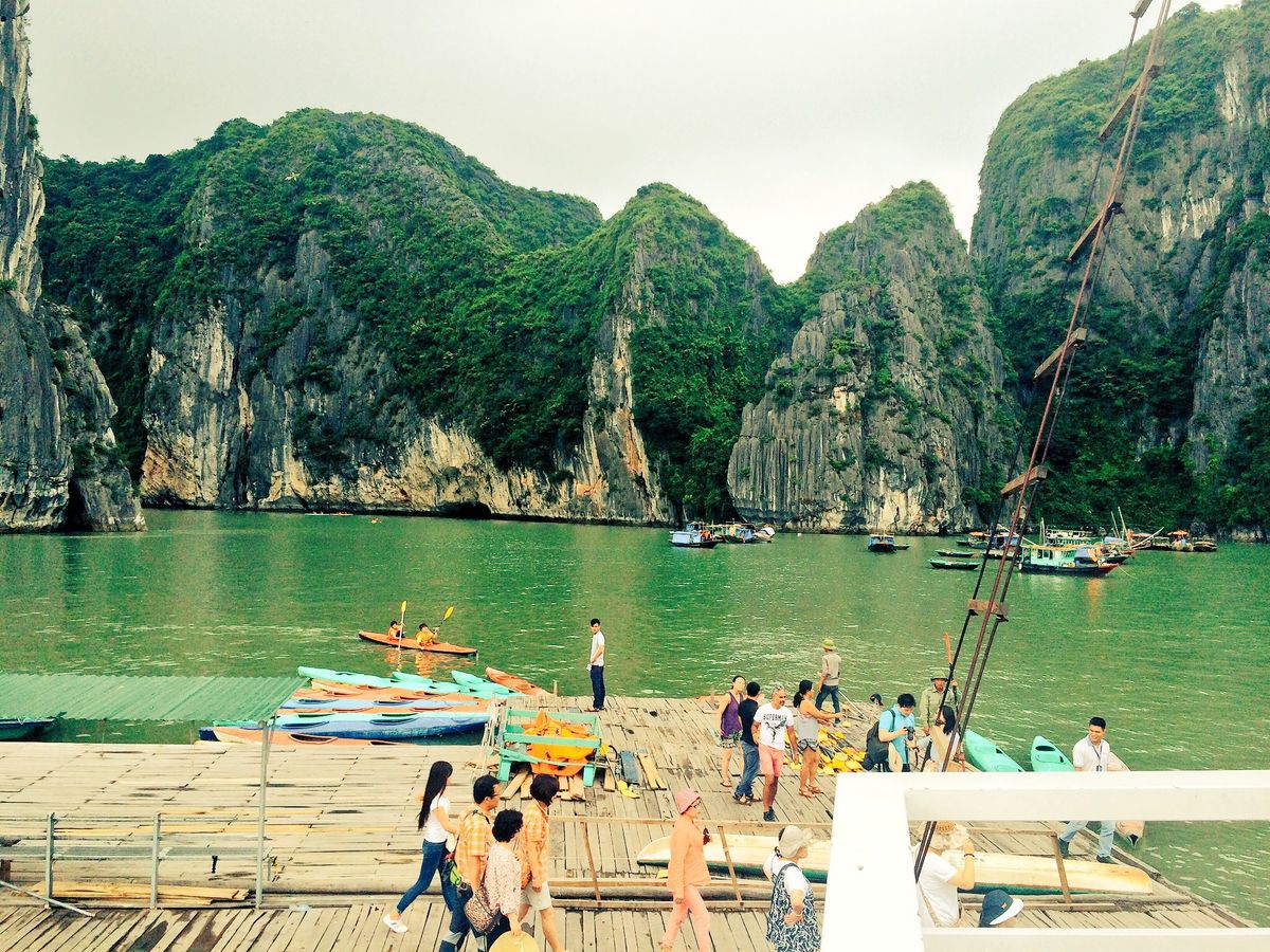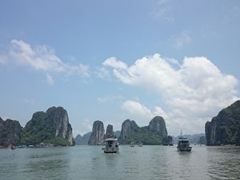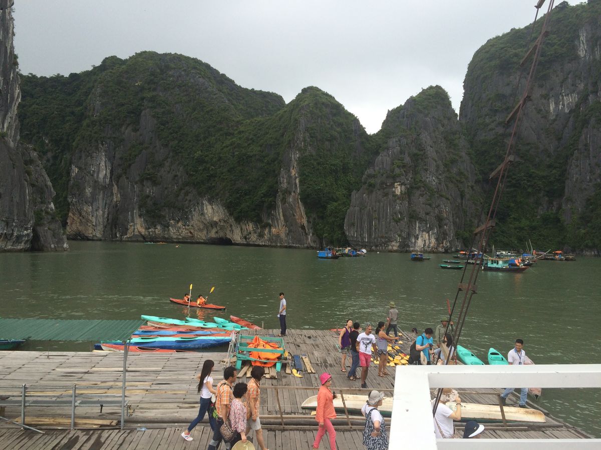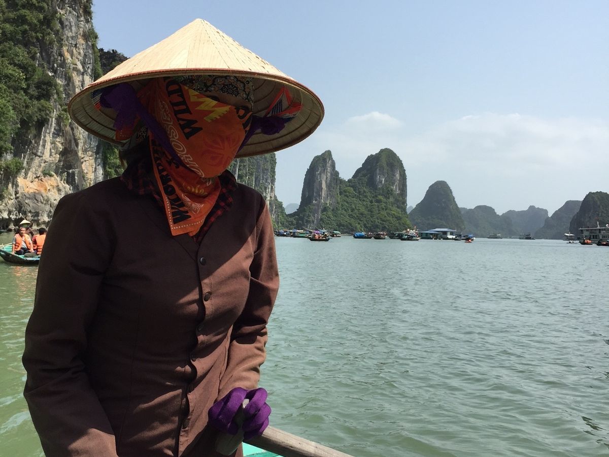 雨期に入ったベトナム、今回ハノイを起点に回ることにして雨でも中国の桂林のように美しいというハロン湾ツアーに申し込みました。でも日頃の行いのお陰で?暑いくらい良い天気でした。ガイドのファーさんが親父ダジャレを盛り込みながら、わかりやすい解説を終始してくださいます。ハノイ市街からの往復の時間は思った以上に長く感じられます。港に着くと船の多さに世界遺産なのだと実感させられました。景色を見る間もなくランチが始まります!4時間ほどのクルーズはあっという間に時間が経ってしまうので要注意です。でも食いしん坊の私は、ついつい食事に集中してしまい、窓から奇岩が目の前に飛び込んでくるのを見つめていました。お料理は当然冷めていますが、白身魚は美味しかったです。途中、海上生活の村と鍾乳洞へ立寄ります。オプションで手こぎのボートに乗りました。地元の女性が淡々とボートを漕いでくれます。カヌーに乗って楽しんでる観光客の方も大勢いてリゾートな雰囲気が満載です。同乗したインド人若者とホーチミン出身の女性と一緒に写真を撮ったり楽しかったです。岩に囲まれた場所は静かで波は全くなく湖にいるようでした。ベトナム人にとっても世界遺産のハロン湾は一度は訪れたい観光地とのことでした。