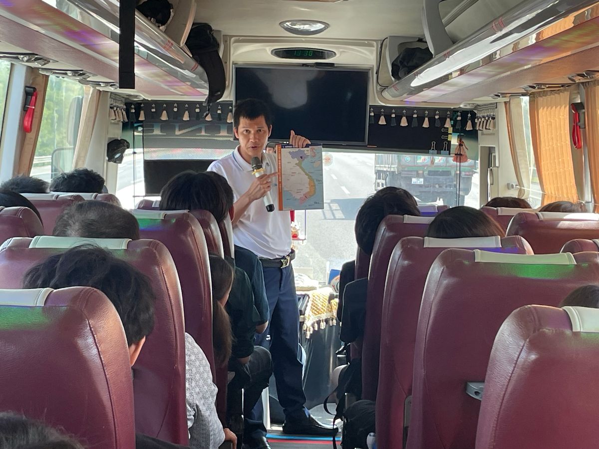 ハノイ旧市街からハロン湾までトイレ休憩を一度挟んで2時間半ほど。その道中を盛り上げてくれるのがガイドさん。今回の担当 Chungさんはベトナムの歴史、今、観光情報までよどみなく説明してくれてこれを聞くとベトナムの旅行が楽しくなるのは間違いなし!