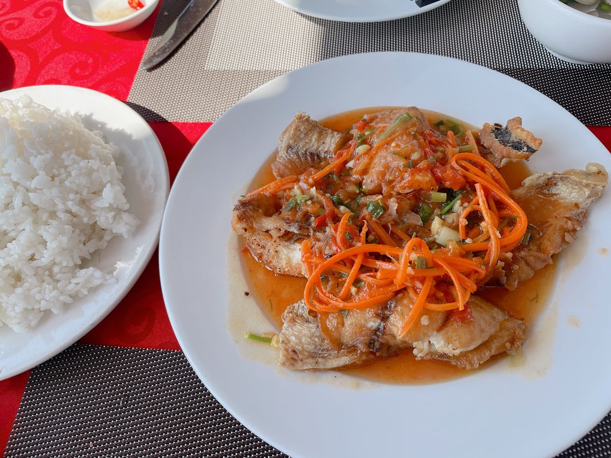 ハロン湾の雄大な絶景を眺めながら、エビやイカなどの海鮮をサーブしていただき、美味しい揚げ春巻きも出てきて、とても優雅でおいしい時間を過ごしました。