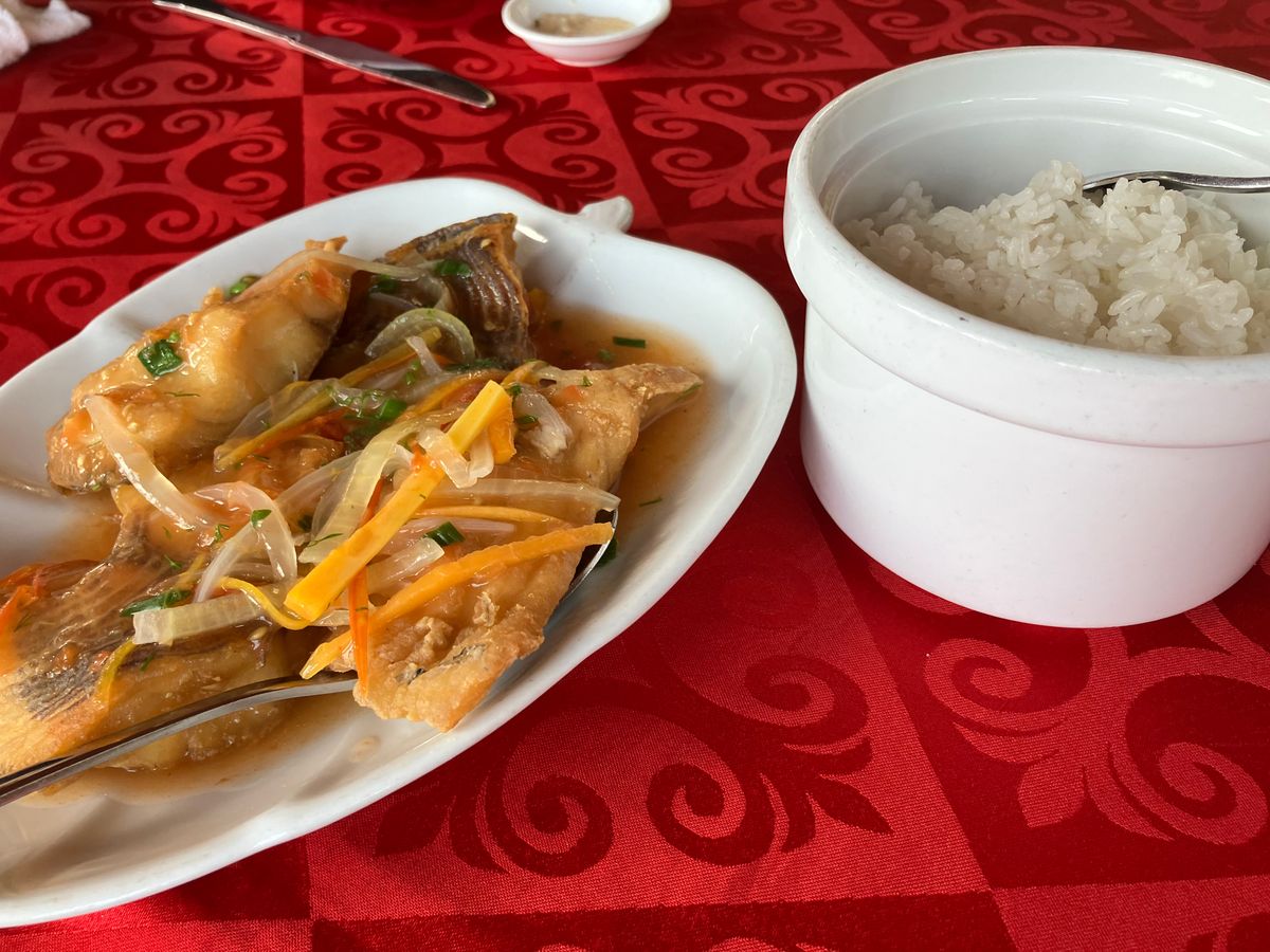 ハロン湾クルーズが始まるとすぐに食事です。6人で1テーブルで相席です。大皿料理で出来立ての料理がたくさん出てきました。美味しいです。