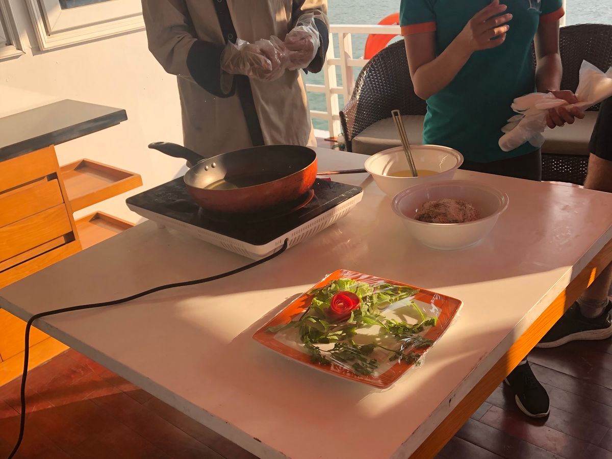 船に戻り今度はクッキングタイム。ベトナム料理体験です。下準備されているので、魚のすり身を丸めて油であげるだけ。ガイドさんとシェフの説明を聞きながら、揚がったら実食。これも美味しかったです。