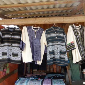 続いてカットカット村散策。階段をどんどん下っていくので帰りが心配になりましたが、終盤は上りです。歩きやすい履き慣れた滑りにくい運動靴をお勧めします。黒モン族の村ですがガイドさんによると近年お土産屋さんが増えて誰だかわからない人達が商売してるとの事でした。そんな中ガイドさんが気を遣ってくれてモン族の機織り、藍染めの人たちのお店(と言うより民家の軒先)に連れて行ってくれて、手作りのお土産を買うことができました。