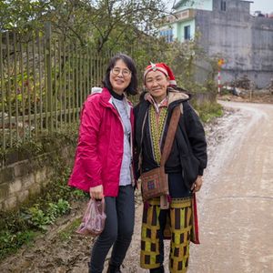 カットカット村の後は、赤ザオ族のターフィン村へ行き、数I’mの散歩。霧も晴れ棚田を見ることができた上、ベトナムの田舎道の散歩は楽しかったです。途中集落で赤ザオ族のおばあちゃん達が道端で刺繍を縫いながら談笑中。眺めていたらひとりがカゴからいろいろ出してきて買ってくれと見せてきます。せっかくですので裏表同時刺繍された布を買っておばあちゃんを応援。別のおばあちゃんが私からも買ってと言ってきたのは少し可哀想でしたがきっちり断って先に進みました。そうしたら布を買ったおばあちゃんが追いかけて来てお守の刺繍のブレスレットをプレゼントしてくれました。記念撮影にも喜んで応じてくれました。