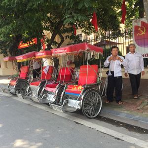シクロのおじさんは小柄で80代の父を彷彿とさせ、ゆっくりスピードで大変申し訳ない気がした。英語は解さずベトナム語オンリー。それでいてスマホでときに交信なさる。スマホしながら運転はバイクも車もよくみかけた。バイクや車や互いの配慮で事故に至らないで済んでいてそれもベトナムらしさだと体感した。歩くぐらいのスピードに思え、バイクも車もバスも混在で右側通行の中走るシクロは優雅なようでとてもスリリング。ハノイの風を感じながら行商の方や喧騒の道路・街中を撮影するならこの散策中がベスト。