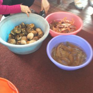 車で3時間半ぐらいでハロン湾につきます、すぐクルーズ船にのりそこでお昼を食べます。メニューは野菜のガーリック炒めやソフトシェルやアサリの炒めたものなど。別途500円でシャコとハマグリを焼いて食べれます。