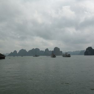 早朝迎えが来てバスで出発しました。いや遠いところです。道も悪いというよりオートバイで混雑していて怖いぐらいでした。ベトナムの運ちゃんはすごい!しばらく走って郊外へ出ると一安心でした。港で船に乗り換えて観光に出発。聞きしにまさる奇岩で楽しい時を過ごしました。食事はまあまあ程度ですが、小舟で魚介を船に売りに来たのでエビなど買いましたがおいしかったです。楽しい時を過ごしました。