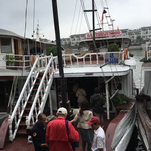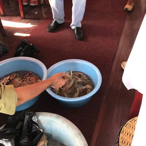 途中、漁船が船に横付けされて、現地の漁師さんが新鮮なはまぐりや、シャコをバケツ一杯に販売にきました。せっかくきたんだからと、はまぐりを購入して食べましたが、とてもおいしかったです。ほとんどの席の方が、購入されていました。