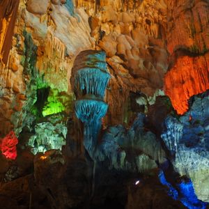 お写真からは、あいにくのお天気のように拝見しますが、とてもきれいなお写真ですね。ライトアップされた鍾乳洞のお写真も、素敵でございます。