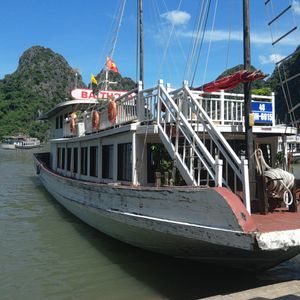 ハノイのオペラハウスで待つこと15分、少し不安になる中、電話で問い合わせしたら他の人のピックアップで少し遅れるとの事、間もなくバスが到着しました。ピックアップ対象外のホテルだとオペラハウスでのピックアップとなり、最後になるので、時間は節約できますが、バスの席はラストチョイス。私は後方座席だったので、道中の路面が悪い所でのバウンドが結構きつくて、腰が痛くなりそうでした。ガイドさんの英語は聞き取りやすく、ハロン湾に到着してから乗った船もとても綺麗に清掃されていて、お食事もお昼としては満足。ビールも1缶フリーでついていました。お食事は結構テキパキ食べないと、あっという間にハロン湾の中に入り、闘鶏岩に着きます。そこからかつては船上生活をしていた人たちがいた所へ、小船を漕いでくれたお姉さんはとってもチャーミングで、鼻歌を歌いながら漕いでくれました。鍾乳洞もとても綺麗でした。欲を言えば、もう少し鍾乳洞をゆっくり見たかったです。往復の時間がもう少し短くなれば良いのですが、こればかりはベトナムの道路がもっと整備され、交通事情が良くならないと解決はしないかもしれませんね!帰りはホアンキエム湖の湖畔で降ろしてもらったのですが、周辺の夕食スポットとかの簡単なガイドマップ等を配って頂ければ、よりよかったかも・・・私は英語がある程度出来るので良いですが、英語にまったく自信のない方は、日本語ツアーを利用された方が良いかも!逆に昼食の時に日本人で固められてしまったのは、私にとっては英語ツアーに参加しているのに、ちょっと残念な感じでした。ハロン湾に行く途中、往復一回ずつ休憩するのですが、刺繍の絵とか彫刻、宝石などが売っていました。刺繍の絵は確かにあまり他では見ないお土産かもしれませんが、お値段もそれなりなので、良く考えて買えば良いかと・・・宝石もとっても安かったので、一つ試しにエメラルド(と言っていた?確かに台はシルバーだと言っていましたが、石については明確な表現がなかったかも?)のペンダントを買ってみたのですが、やっぱりスワロフスキーでした。お値段を考えると当たり前ですけど・・・!