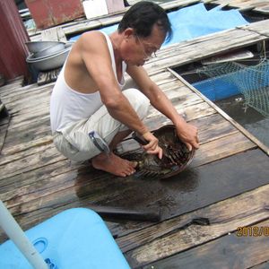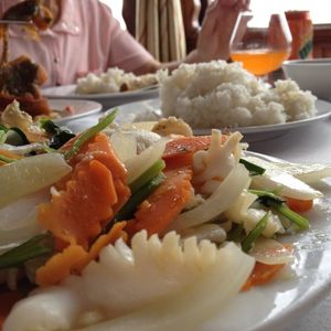 水上生簀のような場所に立ち寄り好みの魚、カニ、エビ等を買うと船内で調理してくれます。価格は高めだったそうです。