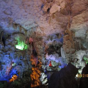 鍾乳洞は蒸し暑く、赤や青、黄色等のライトアップがされていました。中国の支援と聞いて納得の彩りです。帰りの階段が急でヒールで行くと大変かもしれません。