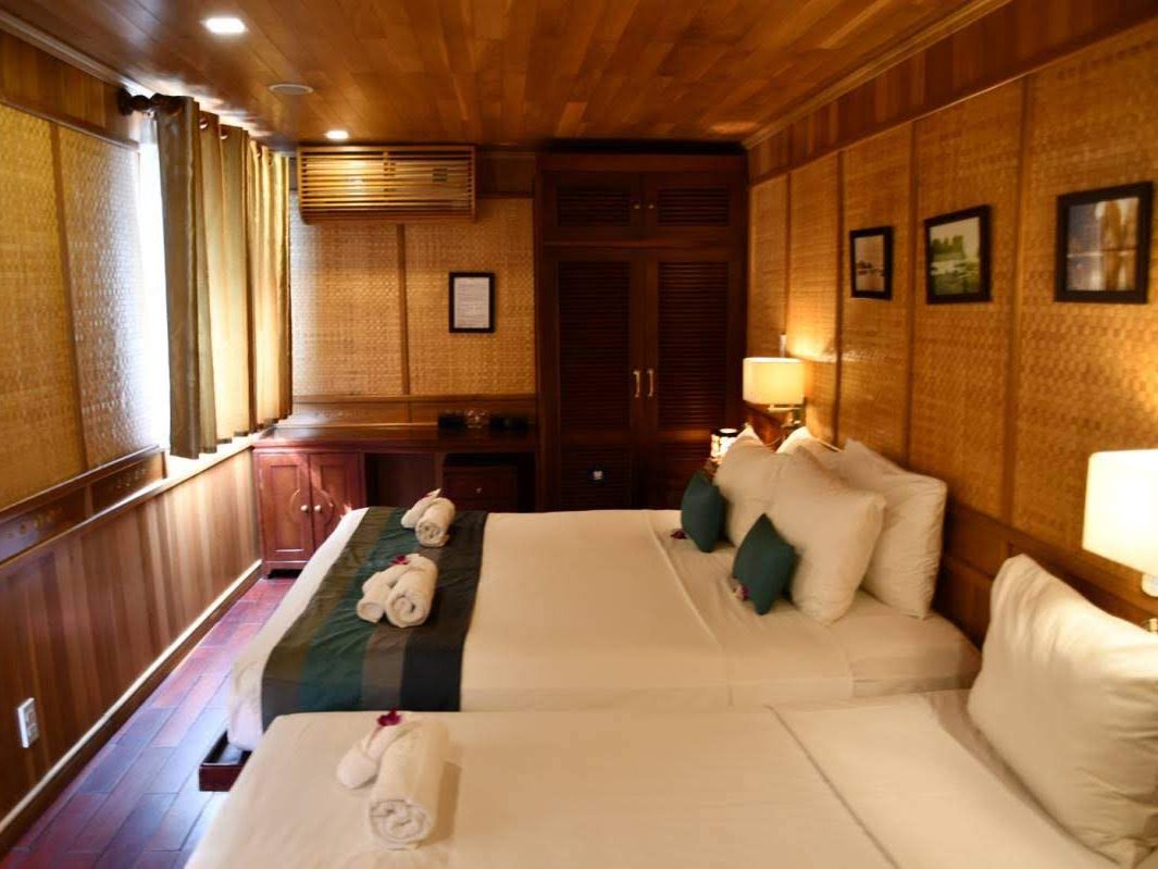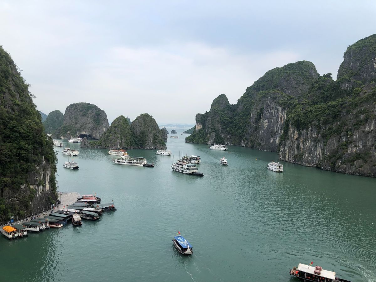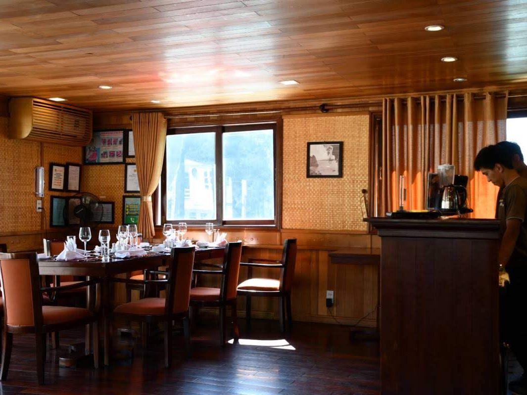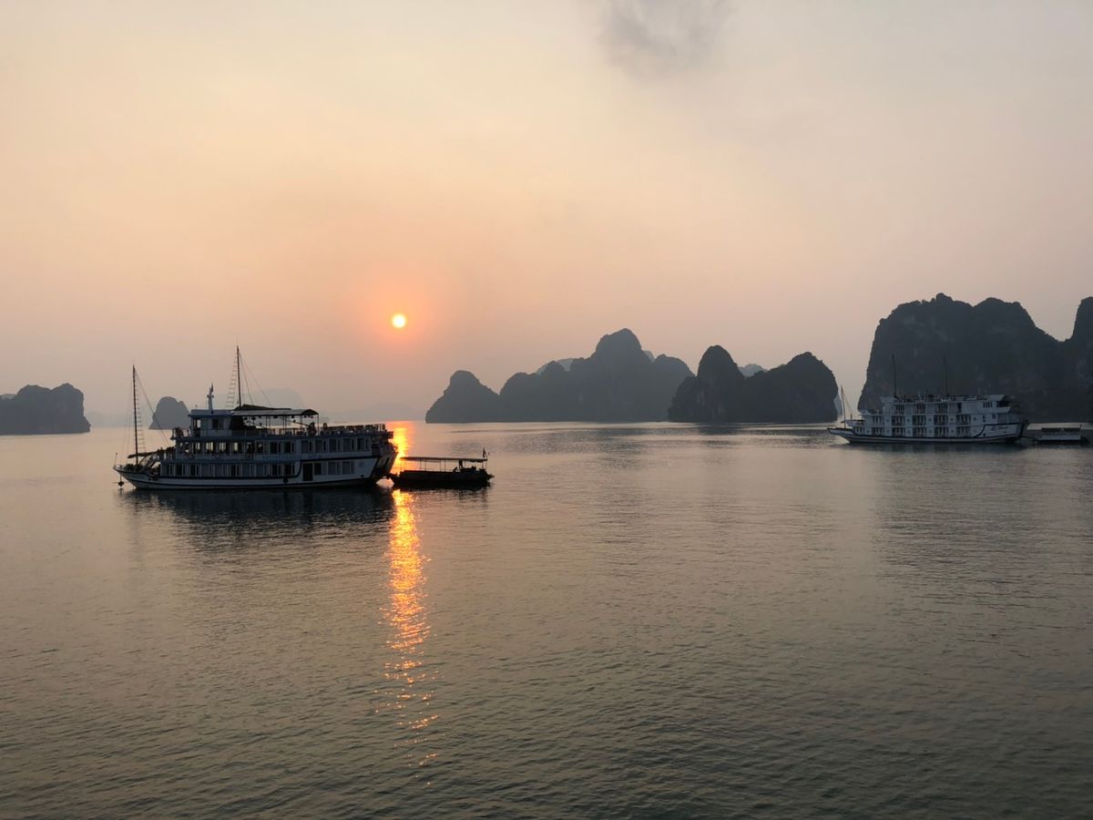 ハロン湾は素晴らしく、小さな島々、鍾乳洞や竹の船やカヤック体験など一度は訪れて損はないです。部屋はスイートに泊まりました。部屋の家具や広いベランダは良かったんですが、船首がタイタニックの真似をする他のお客さんが次々と現れて、ベランダでくつろいでいても落ち着かない感じで、中国人の団体客から写真を撮ってくれと言われて、わざわざ部屋を出て撮りに行く始末。。全体的に古くて洗面台は壊れていて、水が流れず。。結構なお値段だった割には飲み物が全て別で高いです。スタッフは皆さん良かったんですが、唯一残念だったのはマネージャが最初に船内は喫煙禁止、ベランダで喫煙し必ず灰皿に捨てるようにときつくお客さんに言ってあるのにレストランのスタッフが夜遅くにタバコを一本海に捨てたところを見てしまったこと。あとは片道2時間以上移動するのに、ピックアップしてくれるホテルが限られていて、先に泊まるホテルに来てくれるか確認してからホテルを決めないと集合場所まで移動したり、帰りも自分でタクシーを拾わないといけないので大変でした。ハロン湾は素晴らしいけど、ツアーの選択は個人の事情に合わせてよく吟味が必要です。客船が何十隻もあるので、内容も様々です。