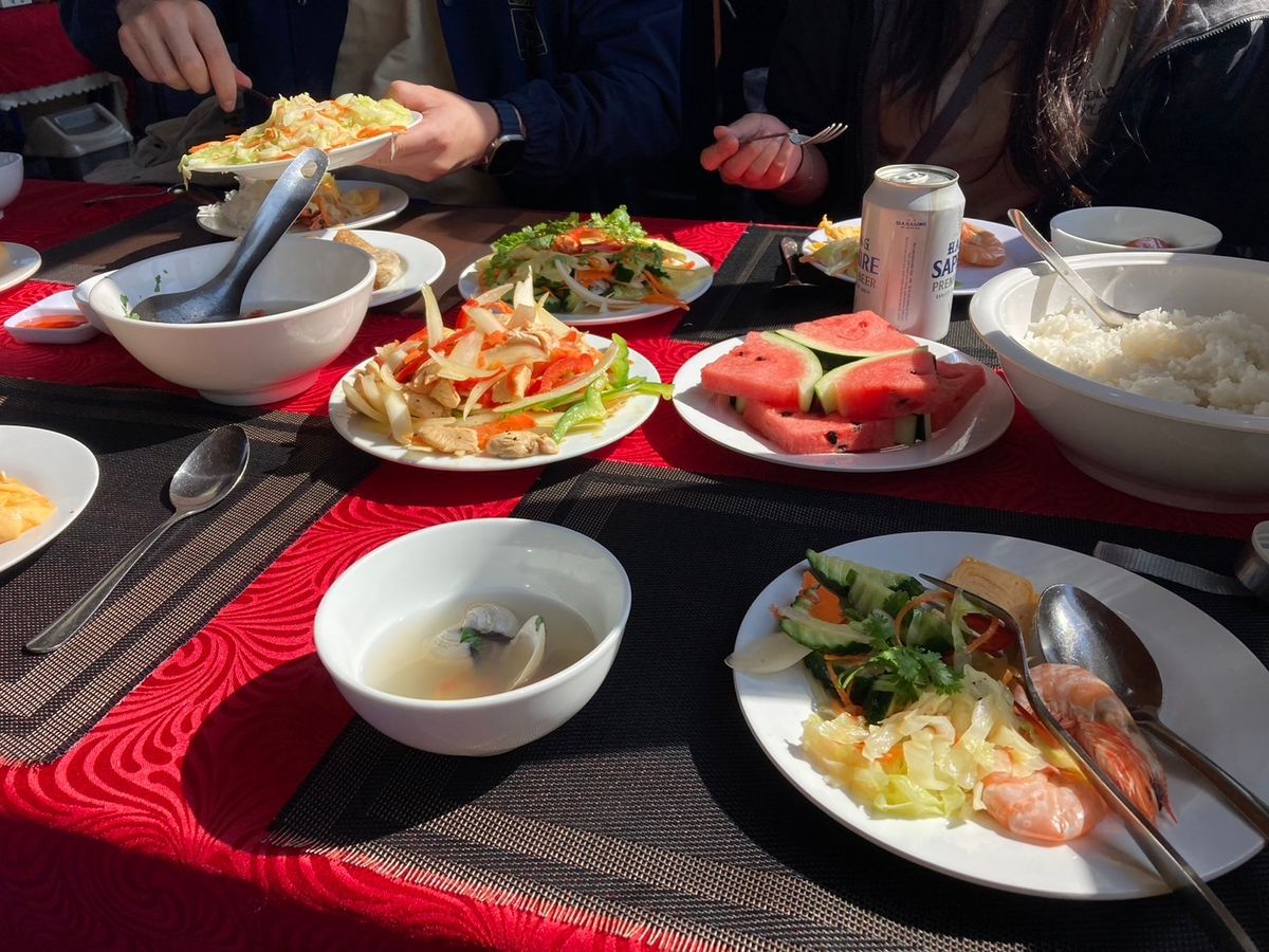 安いツアーだったのでそこまで期待していませんでしたが、ランチもそこそこ美味しく、充実した1日を過ごせました。船の中でランチを食べて、バンブーボートに乗って、400段の階段を登って、鍾乳洞を歩いて、と体力的には少しハードなツアーでしたが、最後のサンセットで癒されました。
