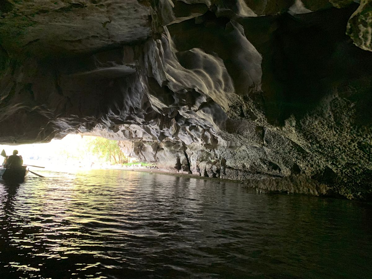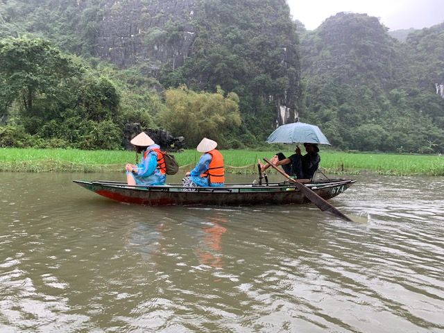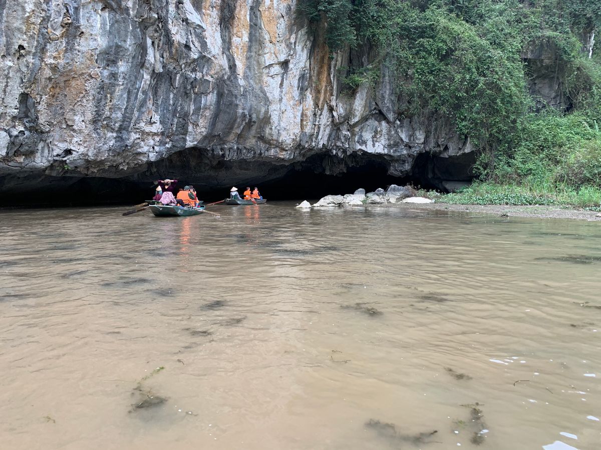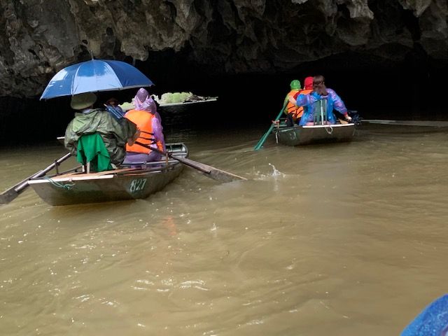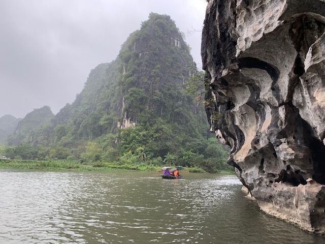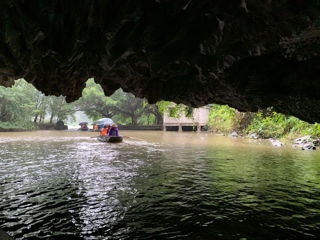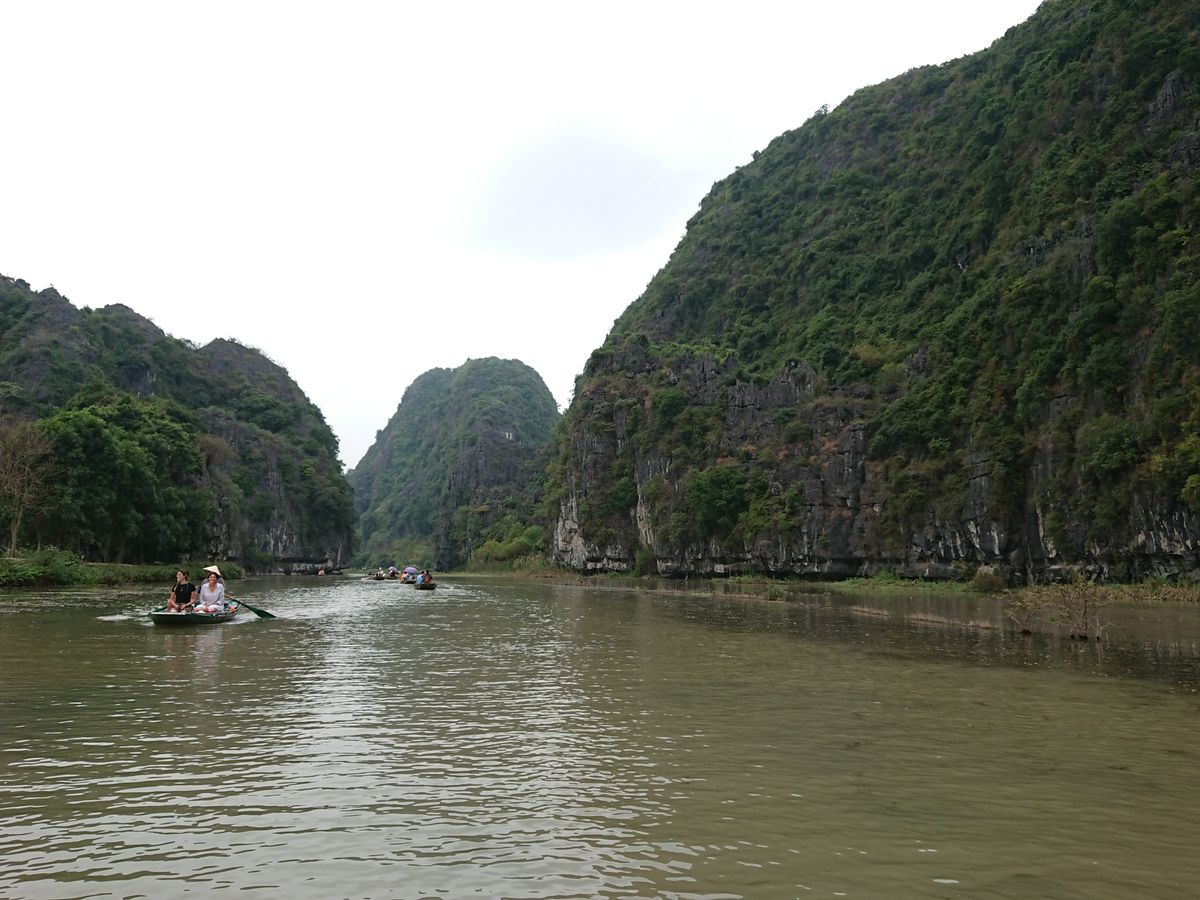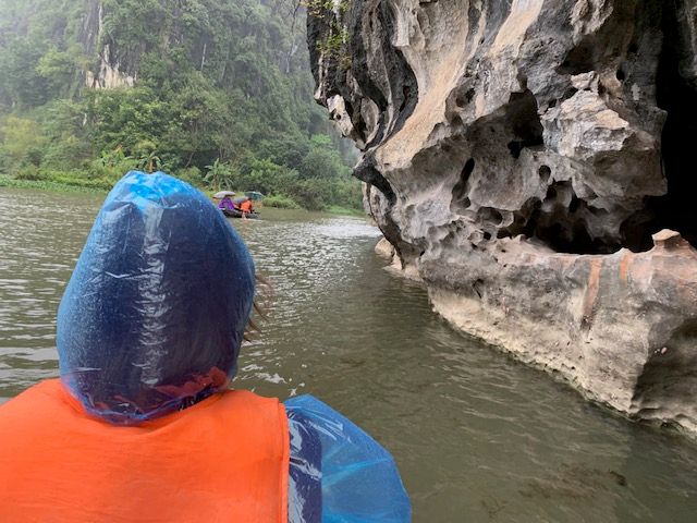 小さな手漕ぎボートに乗り、川を下るのですが、雨風が強かったため、ボートが揺れドキドキしました。とてもスリリングでした。船頭さんがオールを足で器用に漕いで川を下っていくと大きな競り立つ岩々、頭スレスレノの洞窟等見どころ満載です。川面に浮かぶ蓮の花、アヒルの群れに遭遇したりと美しい景色に魅了させっぱなしでした。