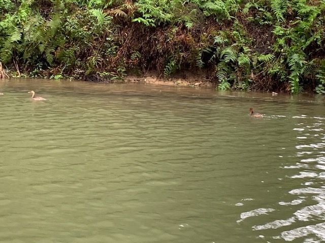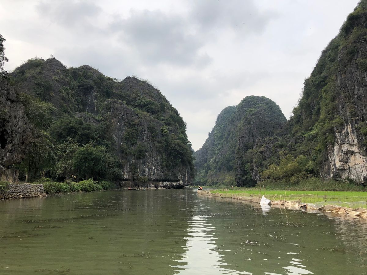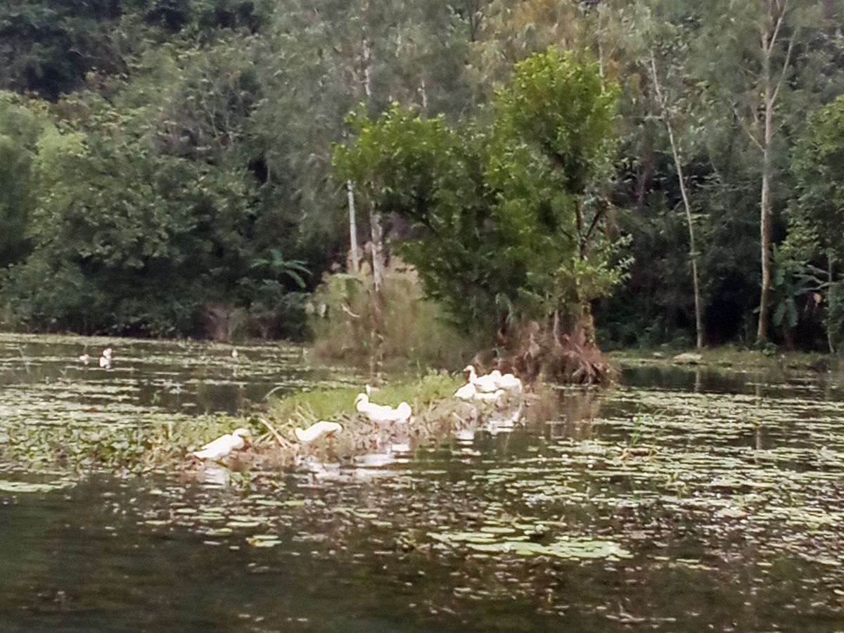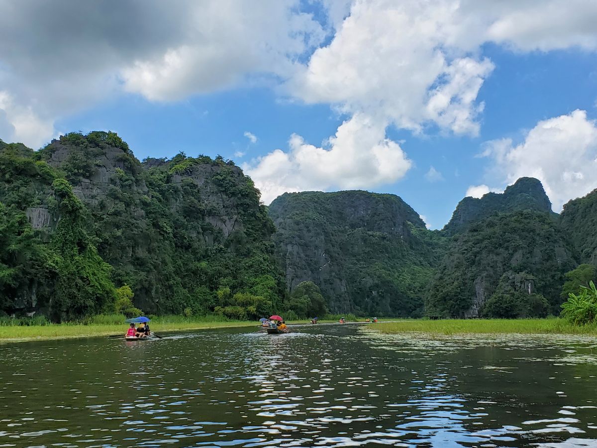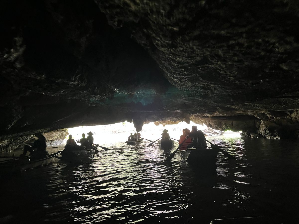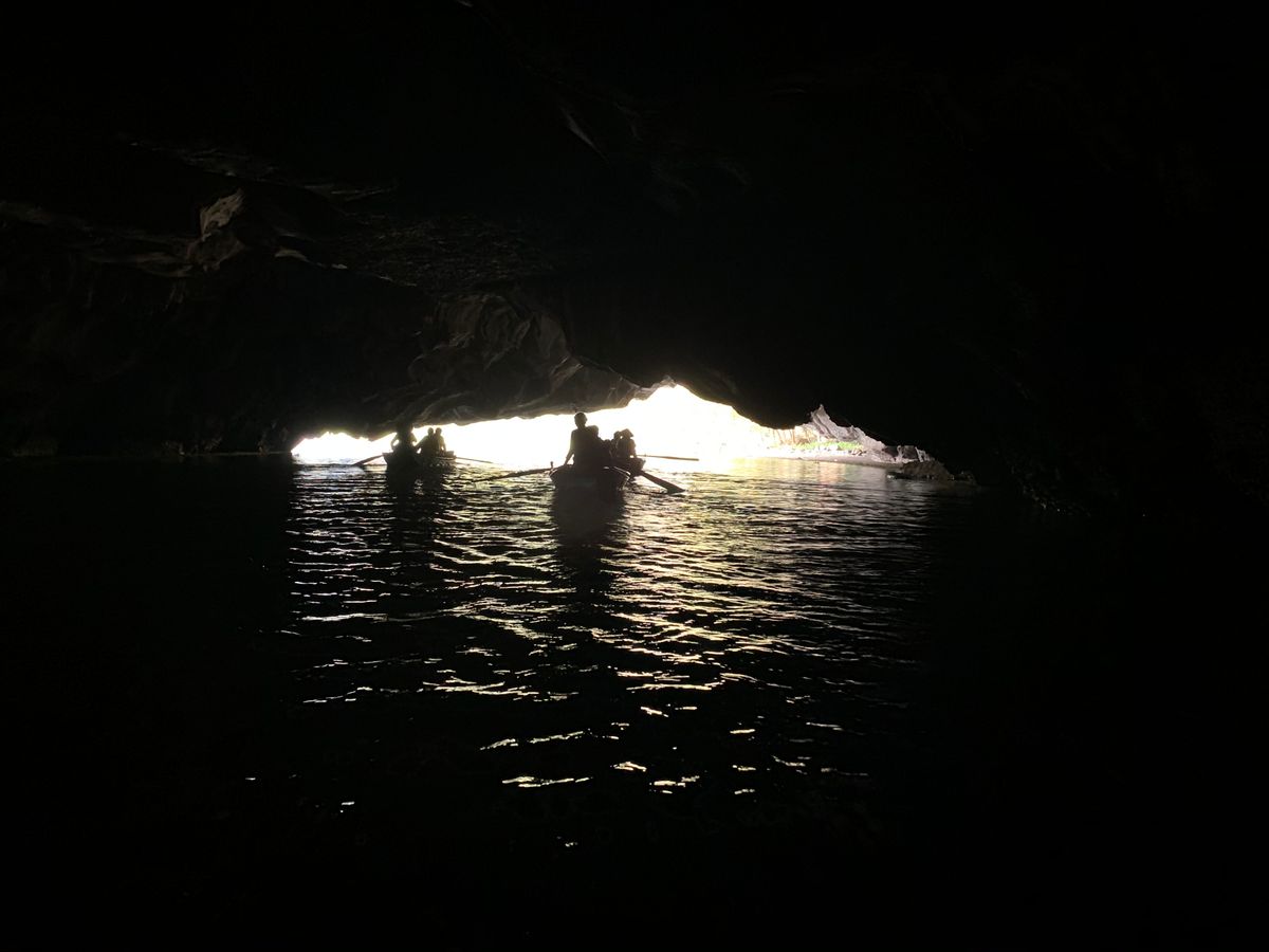小さな手漕ぎボートに乗り、川を下るのですが、雨風が強かったため、ボートが揺れドキドキしました。とてもスリリングでした。船頭さんがオールを足で器用に漕いで川を下っていくと大きな競り立つ岩々、頭スレスレノの洞窟等見どころ満載です。川面に浮かぶ蓮の花、アヒルの群れに遭遇したりと美しい景色に魅了させっぱなしでした。