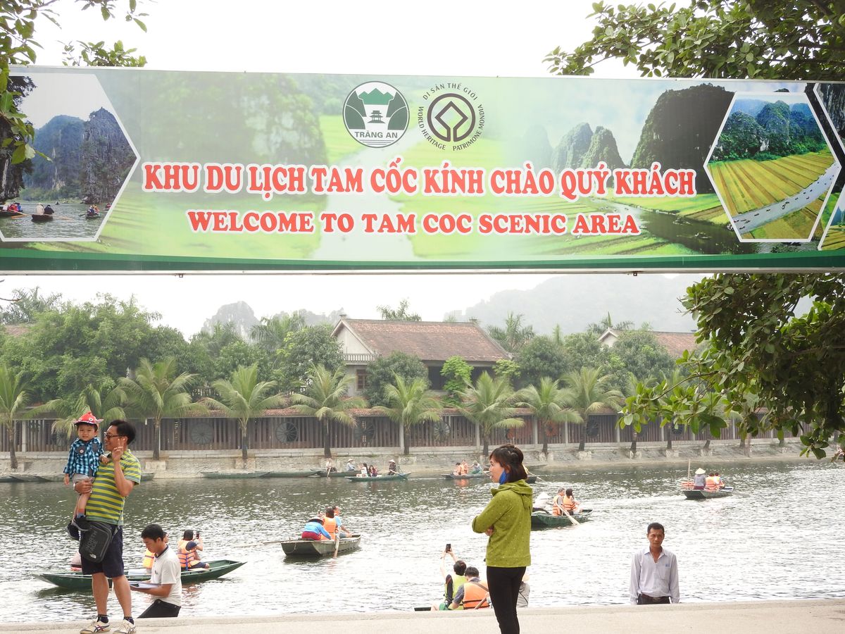 古都ホアルーに着くと、ハノイに遷都される前の歴史の話をガイドさんが丁寧に説明してくれました。日本で言う京都や奈良にも似たような雰囲気がを感じました。休憩で立ち寄った土産店で川下りのためのカッパを買いタムコックへ向かいました。