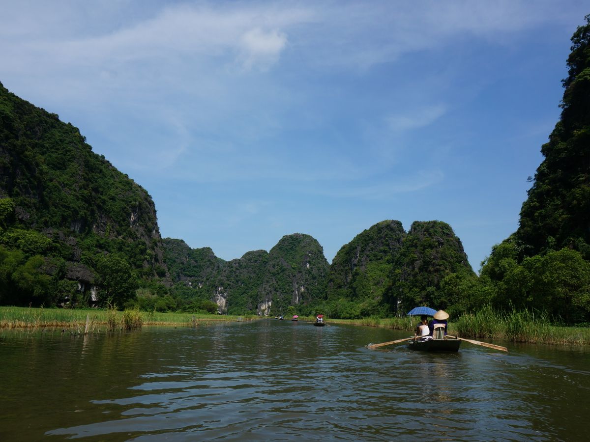 当日はハノイ出発時は曇りでしたが、タムコックは晴れ間も多く、1時間半ほど小舟に乗っての景色は素晴らしかったです!山々の景色を見ながら川をすすみ洞窟も3つほど通っていきます。のんびりとした景色がずっと続きとても癒されました。