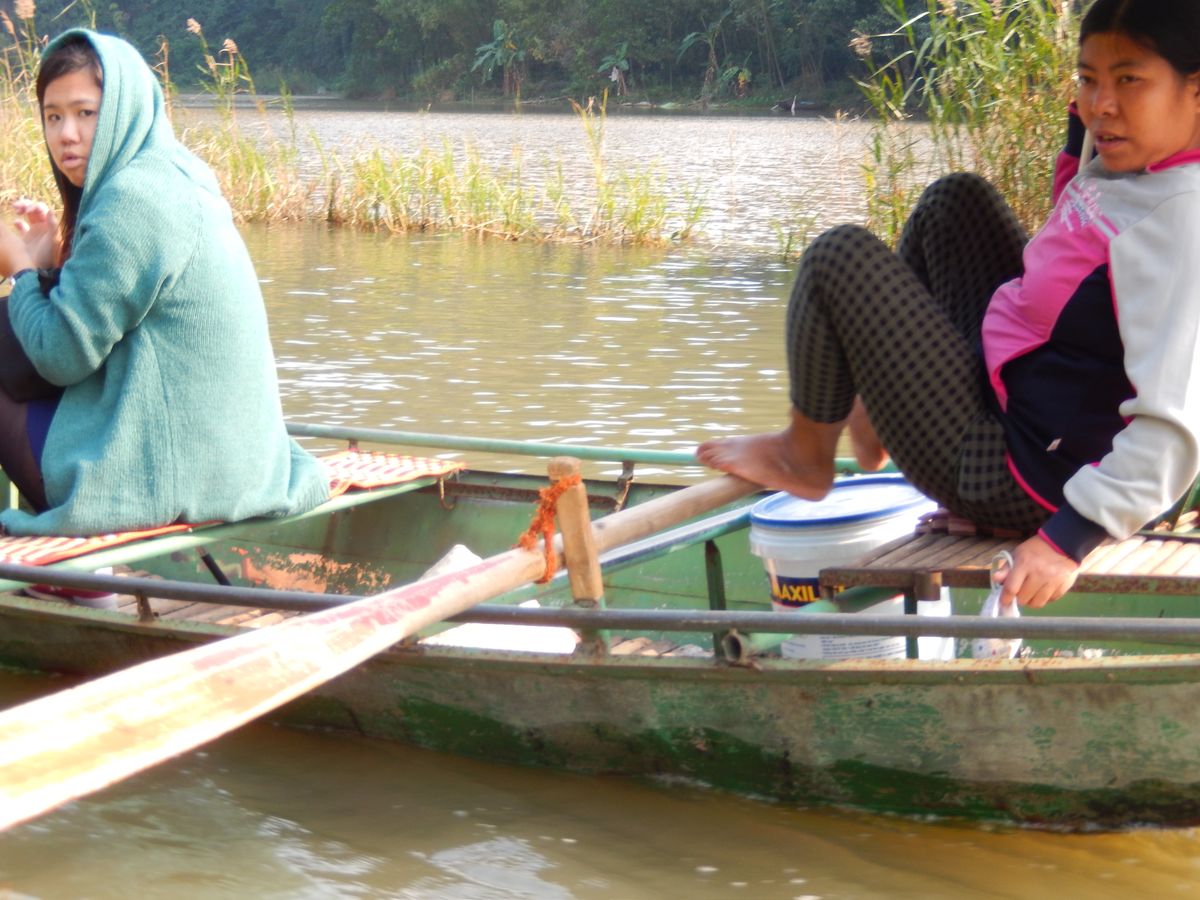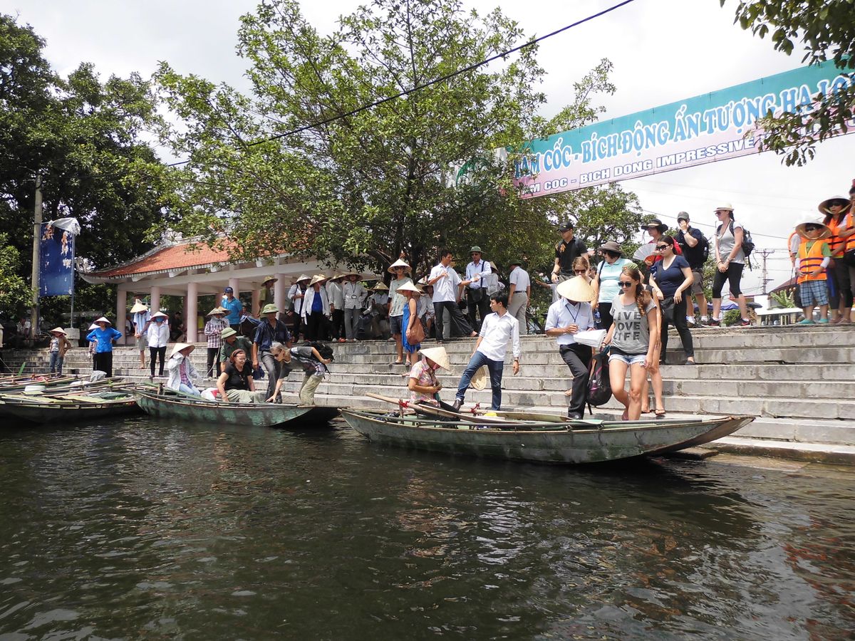 ホアルーから、またバスにのって、小舟に乗るタムコックに行き、まずは昼食。レストランはボート乗り場の目の前。ビュッフェスタイルで、フォーやお肉の料理を食べる。見た目も味も普通。ツアー客同士でテーブルを囲んでビールで乾杯したり(飲み物は別料金)して、テンションをあげた。このレストランは、店先で2ドル売っている笹帽子(ノンラー)を半額(1ドル)で貸してくれたりもするので、小舟に乗る際、帽子を持っていないヒトは借りてもよいかも。