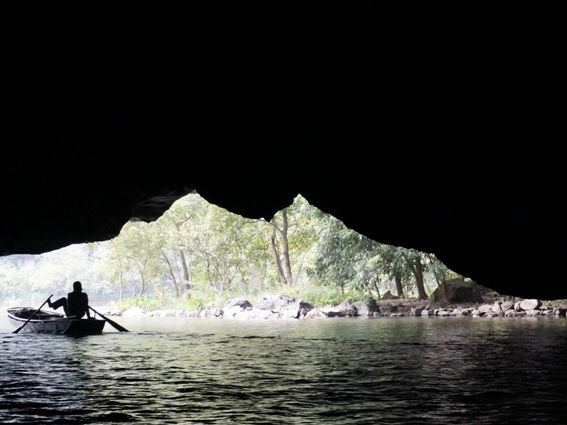 往復でおよそ2時間の船旅の途中、洞窟を通過したり、足で船を漕ぐ様子を見学したりと