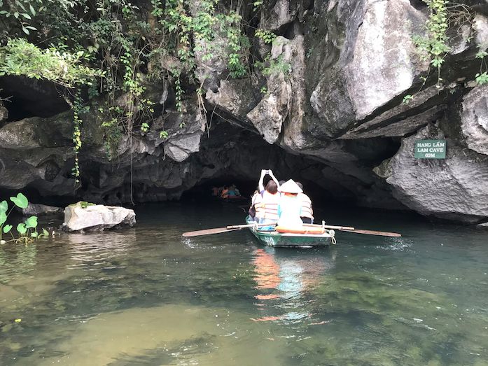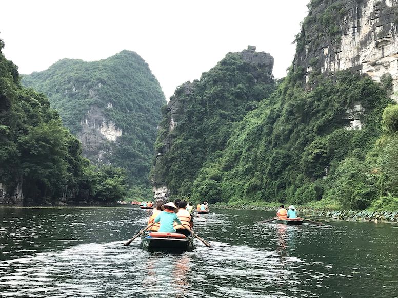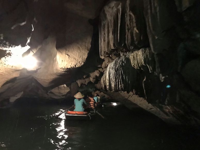 その後チャンアンで2〜3時間小舟にのって川をのんびり移動しました。その間幾多もの洞窟を抜けて行きましたが、洞窟を抜けるたびにチャンアンの絶景が広がりまるでジェラシックパークのようでした。洞窟では天井が低いところがあり、屈まないとぶつかってしまうような箇所もあって冒険してる感じがありました。小舟乗ってる間は洞窟以外日陰がないので帽子は必須です。(私は持ってなかったので近くの露店でベトナムっぽい帽子を買いました。)