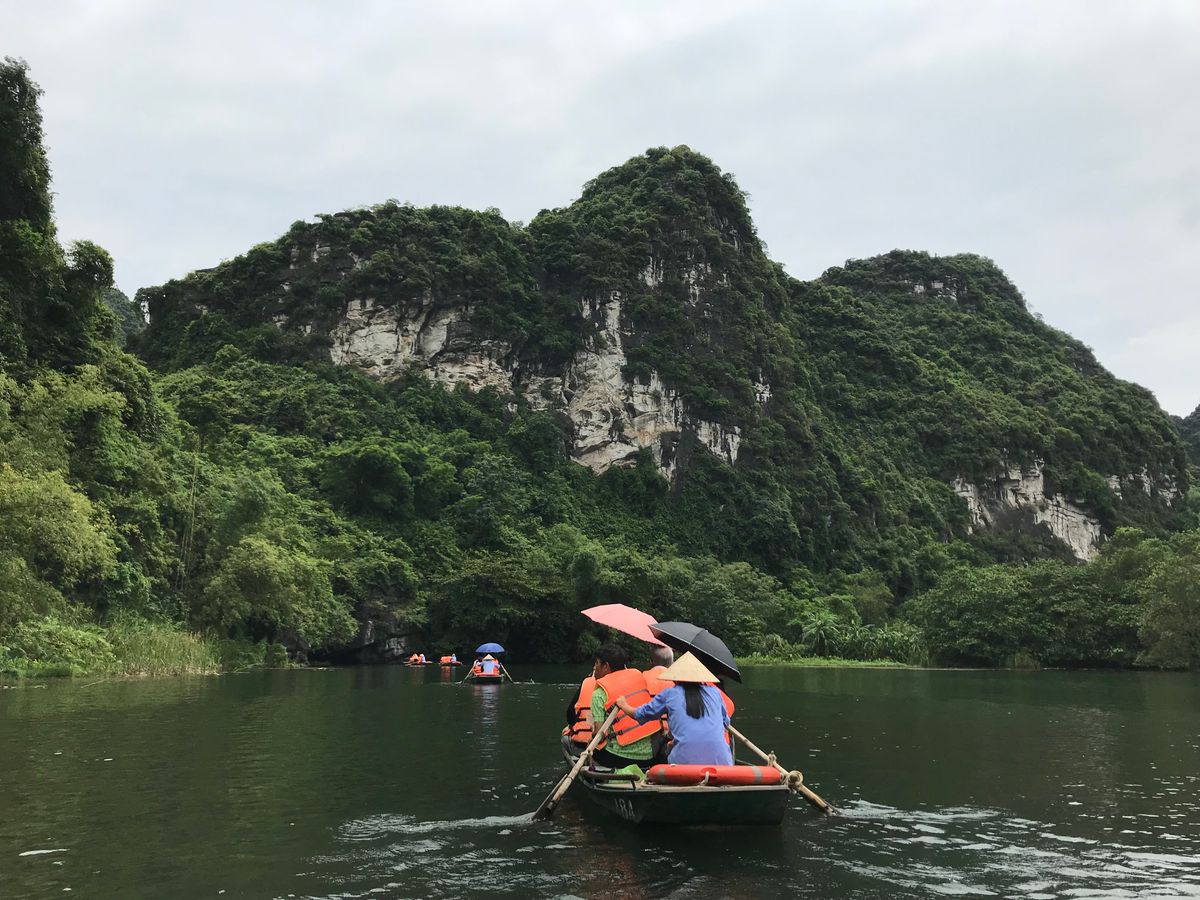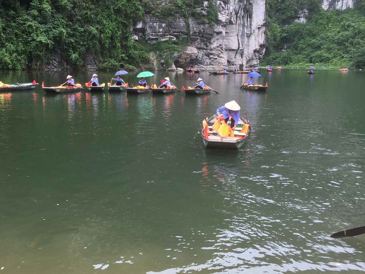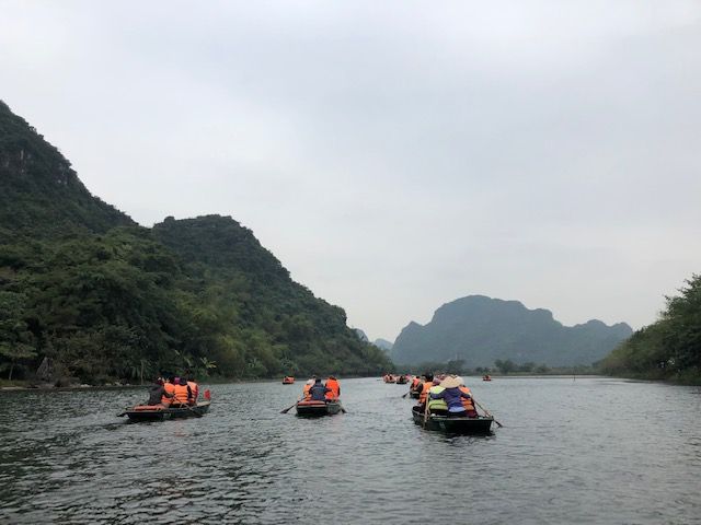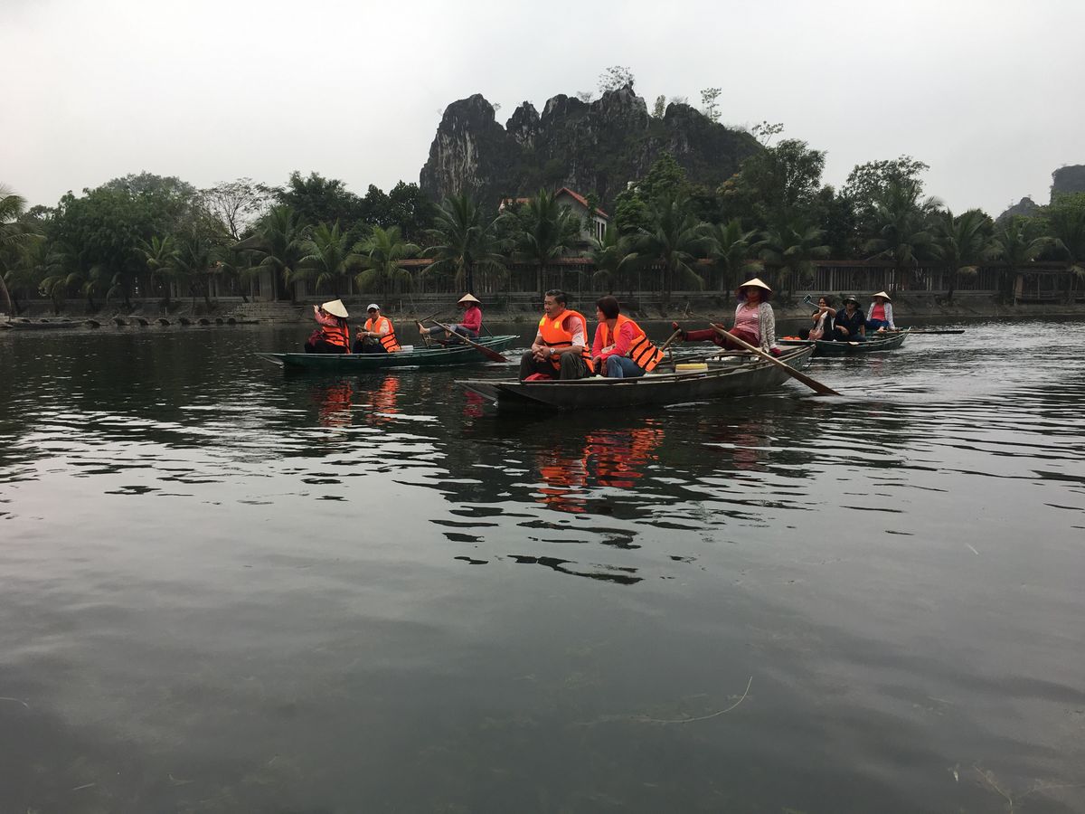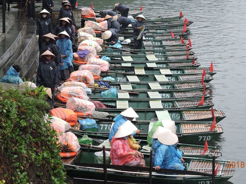 2018年12月に3人で参加しました。小雨の中、気温は17度、ベトナムの中でもハノイは四季がはっきりしていて、12月は長袖、雨用のヤッケが必須です。折りたたみ傘は持参しましたが、レインコートはホアルーに着くと物売りのおばさんから2万VD(約100円)で買いました。小舟には2時間程度乗り、降りる時5万VD(約250円)チップを渡しました。「ハロン湾」より絶景が近くで見れ、3カ所の洞窟を小舟で入ります。3人家族で1艘、ゆったりしていました。