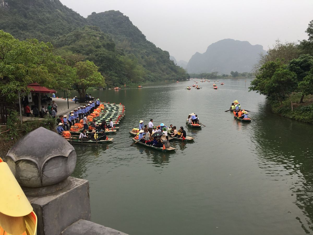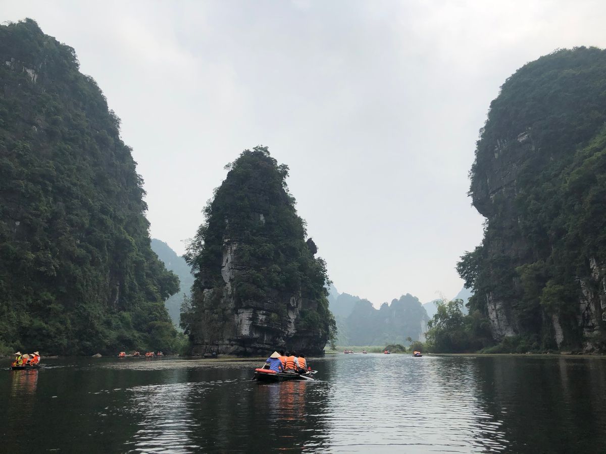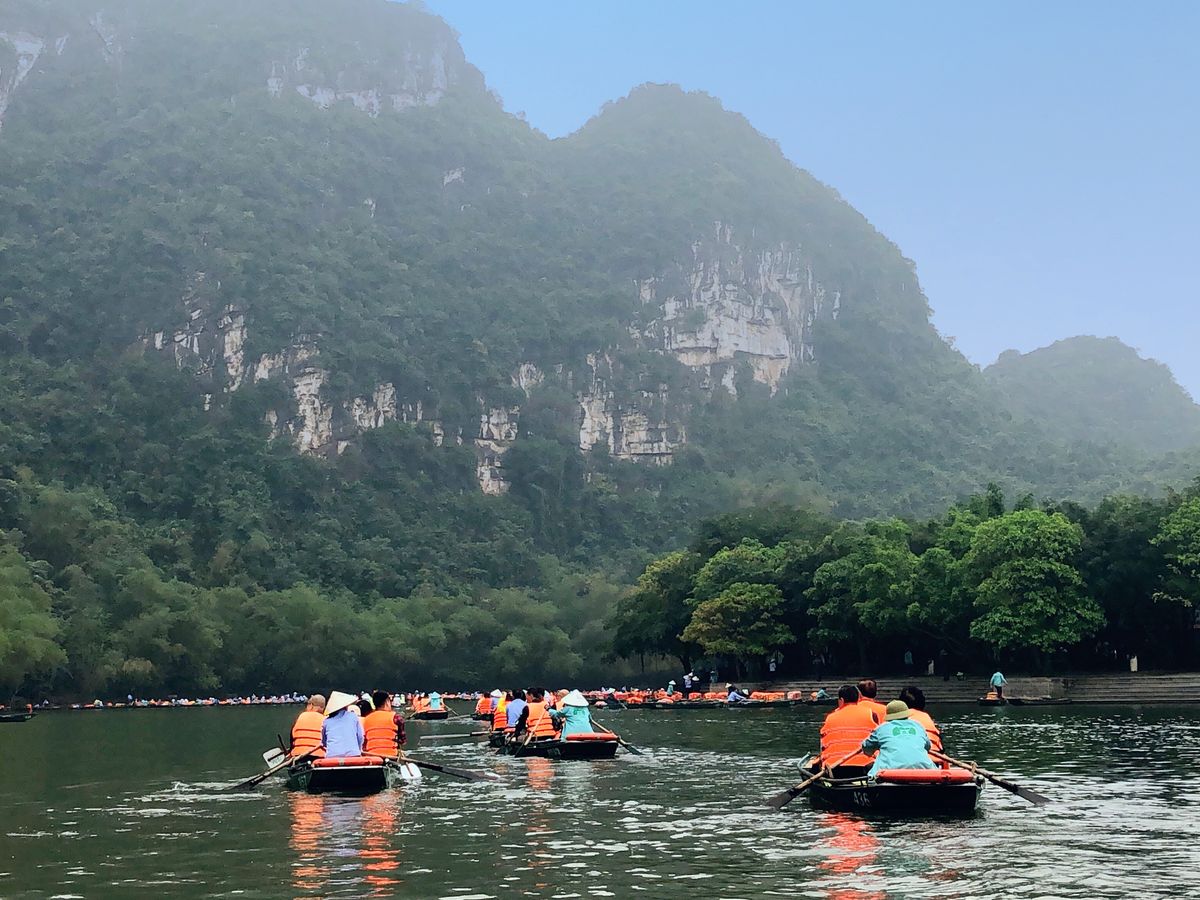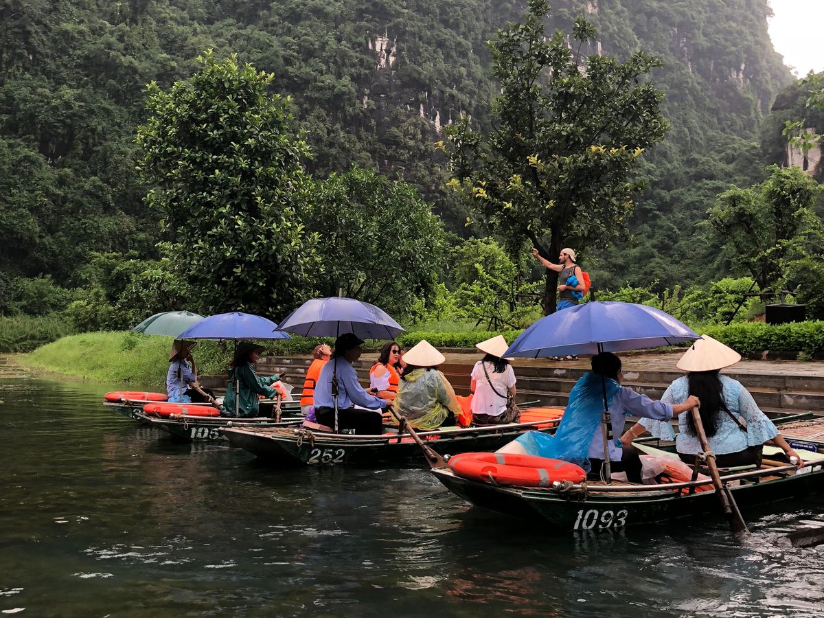 2018年12月に3人で参加しました。小雨の中、気温は17度、ベトナムの中でもハノイは四季がはっきりしていて、12月は長袖、雨用のヤッケが必須です。折りたたみ傘は持参しましたが、レインコートはホアルーに着くと物売りのおばさんから2万VD(約100円)で買いました。小舟には2時間程度乗り、降りる時5万VD(約250円)チップを渡しました。「ハロン湾」より絶景が近くで見れ、3カ所の洞窟を小舟で入ります。3人家族で1艘、ゆったりしていました。