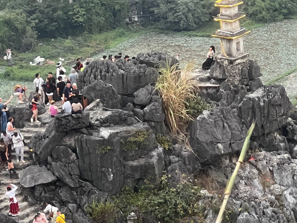 こちらは洞窟とはいうももの、500段の狭い階段を上っていくとチャンアンの風景が素晴らしく望めます。ガイドさんは途中まで行ってくれましたが、頂上までは友人二人と登りました。とにかく頂上は人も多く、急で危険ではありましたが、龍の頭を触ることができて、満足です。ふもとには一面の水連が咲き乱れ、きれいな写真も撮れました。この辺りはリゾート地のような感じに思えました。