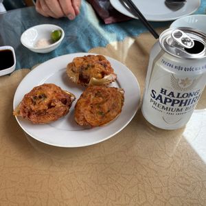 ハノイ歌劇場で他の皆さんと共に日本語ガイドのフィンさんの出迎えを受け、他のホテルからの先客の待つミニバスに乗り込み出発。途中のサービスエリアとお土産屋を経由してハロン湾の乗船場へ。出向してさっそくランチコースのスタート、ドリンクは別料金なのでご注意 (^_^;)