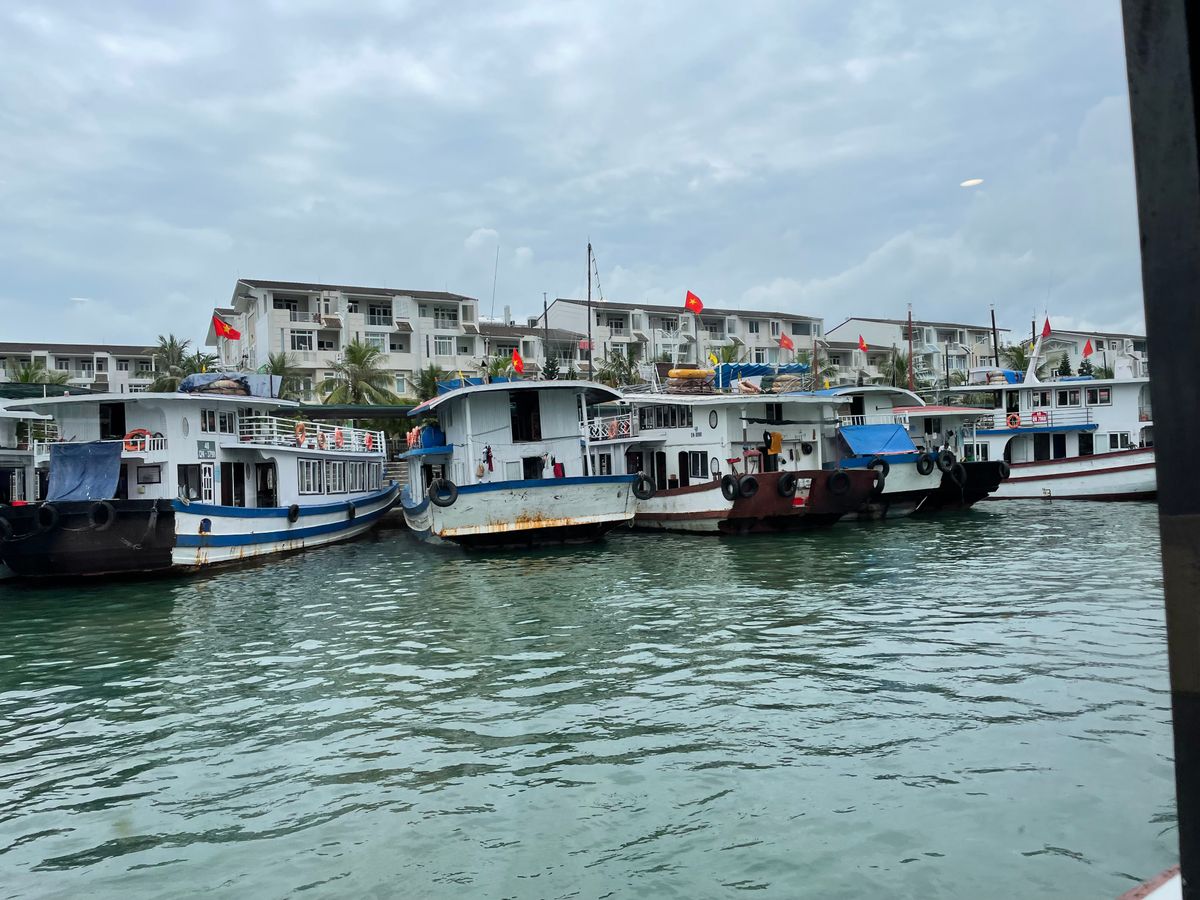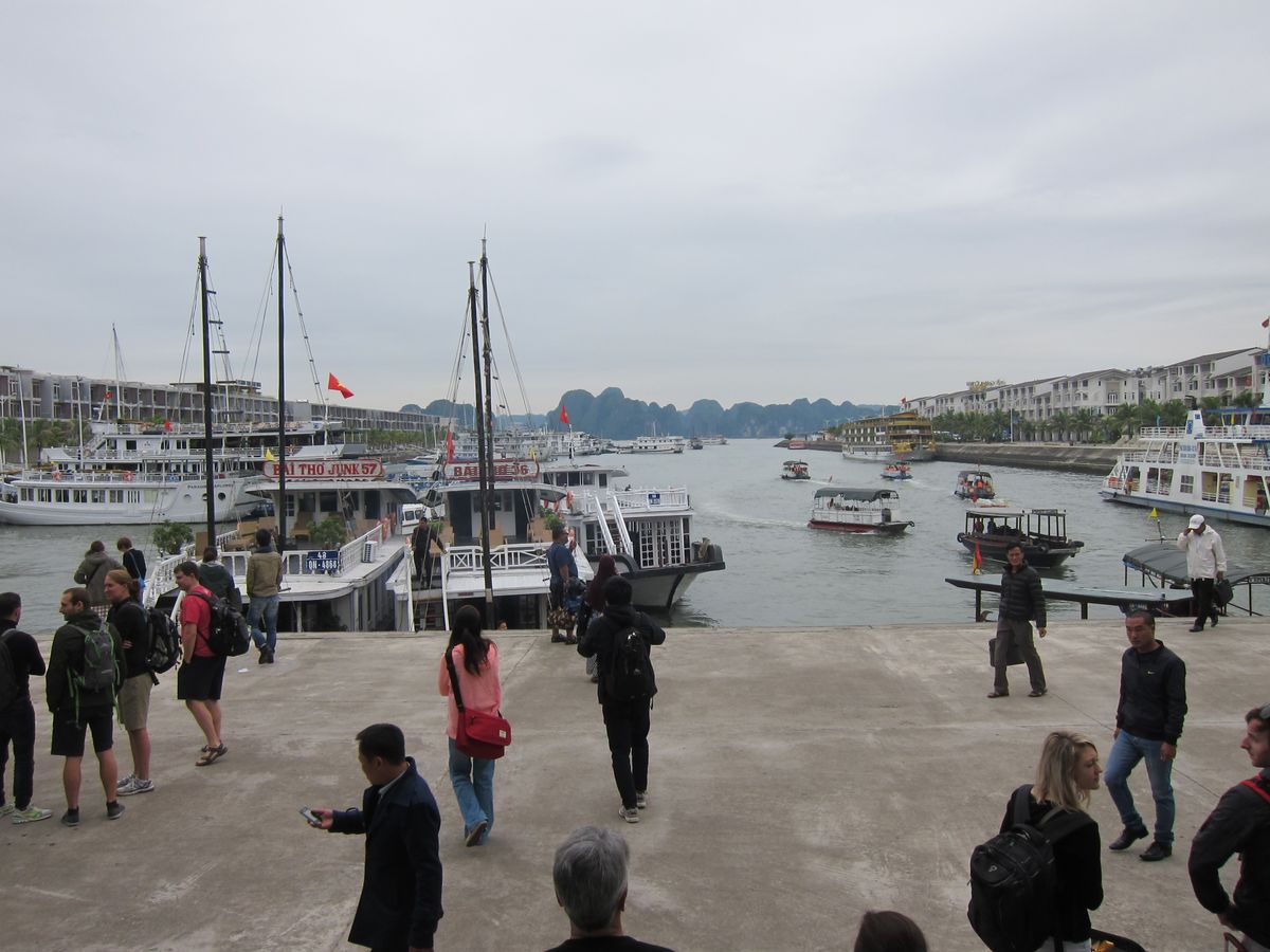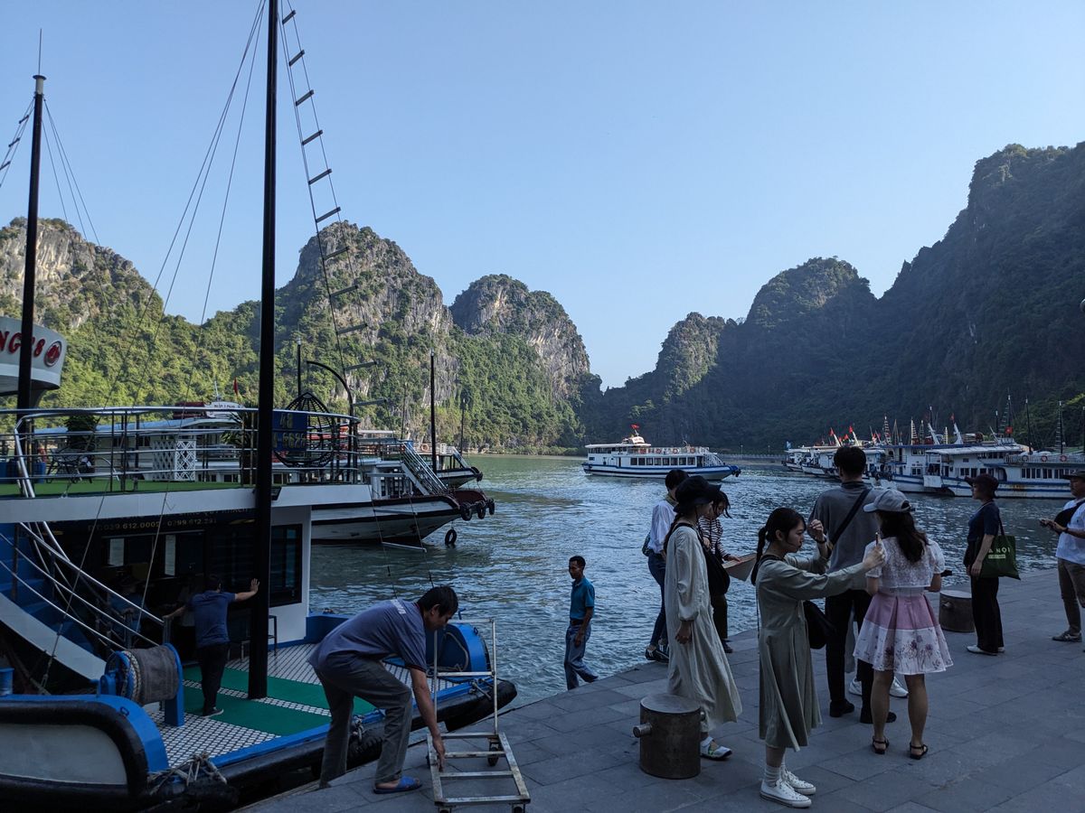 ハロン湾クルーズの乗り場に到着すると、同じようなクルーズ船がひしめき合っていて、案内された船に乗り込みます。