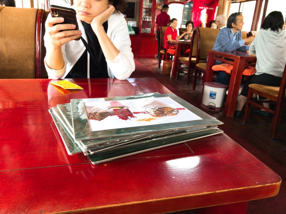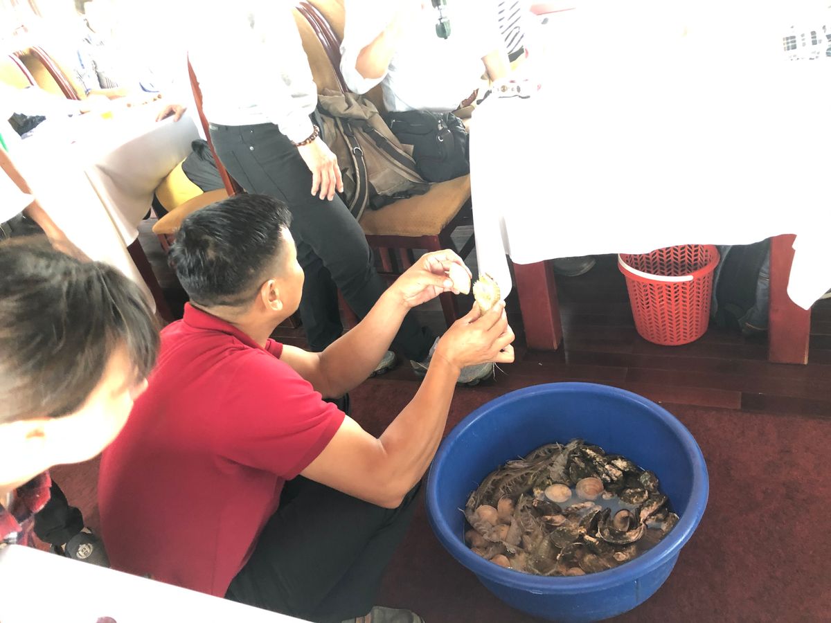 キャンペーンで参加費が安くなっていたので料理をグレードアップして渡り蟹と大きなシャコが付きました。剥きながら食べていると女性スタッフが来て手早く剥いてくれて助かりました。ただ、同じ女性が土産品をあれこれしつこく売り込みに来たのには本当に閉口しました。1つくらい買わないと悪いかな‥と思ってハロン湾で養殖したいう淡水真珠のピアスを買いましたが、やっぱり高かったかも‥。ハロン湾の景観は素晴らしく、鍾乳洞は幻想的で感動していたのにこの押し売りでかなりゲンナリしました。ハロン湾に着く前には焼物の店にも連れて行ってもらい、可愛い焼物を購入しました。5つ買うと1つおまけと言われ、値札を見るとまぁ安いかと思って調子に乗ってセットでいくつか買ってしまったらベトナムドル表示ではなく、USドル表示で思わぬ出費となりました。値札のシールが小さくてコンマかピリオドか分からず引っかかった感がすごいです。ベトナムに来て次の日で換金の計算に慣れてないところで大失敗でした。船上のビールも「3」と言うので3万ドンかと思ったら3USドルで何それ?でした。全部日本語でやっているのだからついでに日本円で言ってくれたら良かったです。