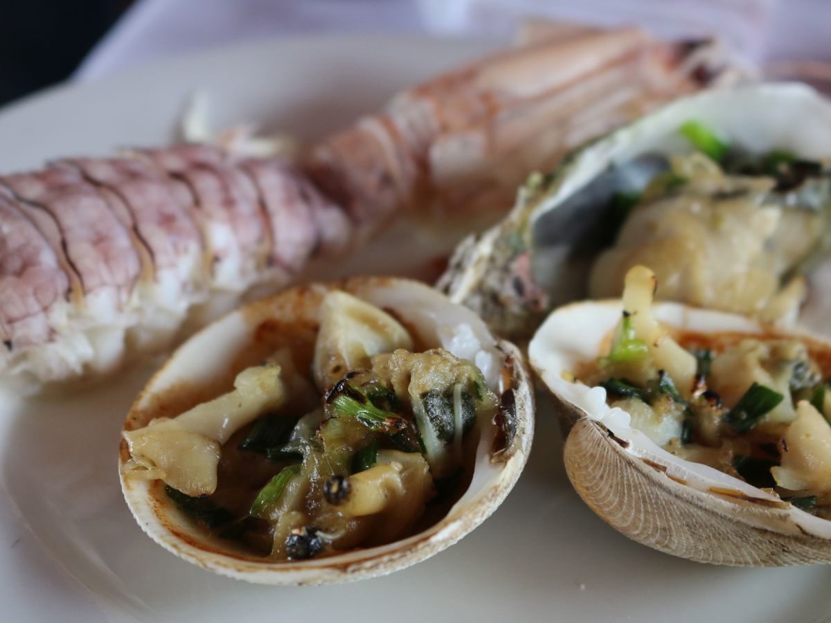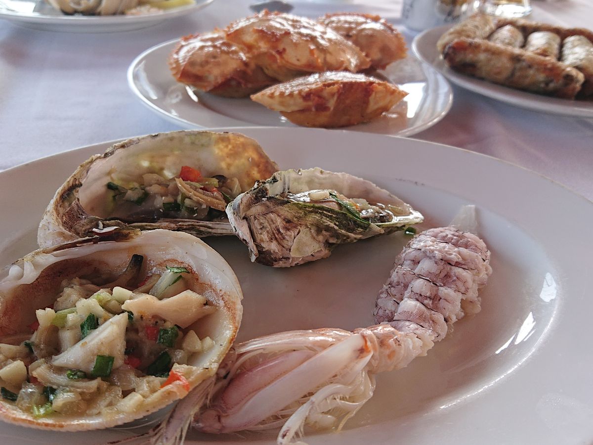 船に乗船したのは1時前くらいです。船に乗ったらすぐ食事が始まります。飲み物は持ち込み禁止だったので購入する必要があるのですが安くはないです。コースの大皿料理以外に牡蠣などの販売もあります。牡蠣2個、ハマグリ1個、シャコ1尾のセットで1500円と強気な値段。。せっかくの旅行なので購入しましたが、まぁ…高い買い物でした(苦笑)これ以外にも食後に物販がありますが、それほどしつこくはありません。(品を変えて何度も来るので少々面倒でしたが…。)