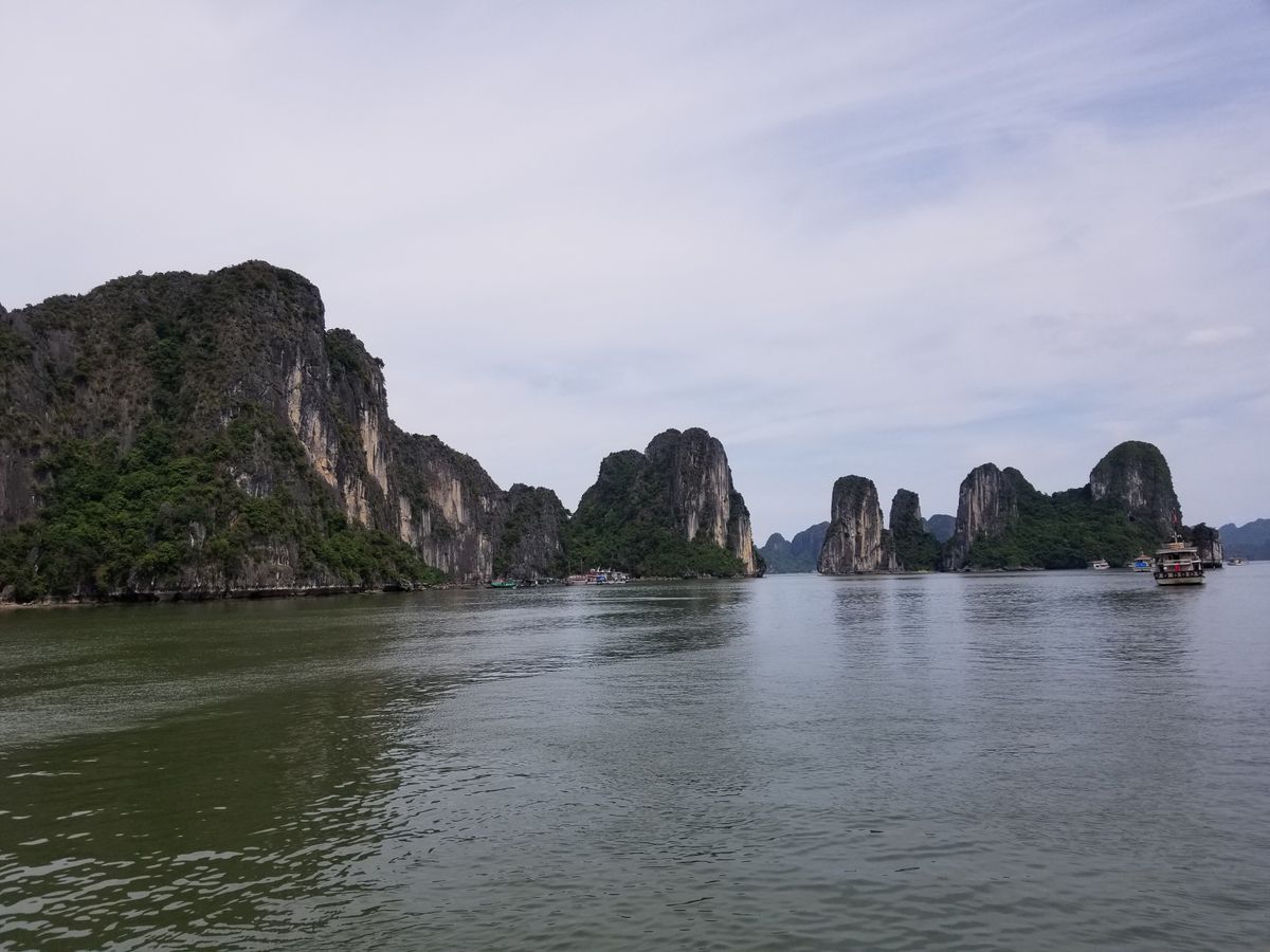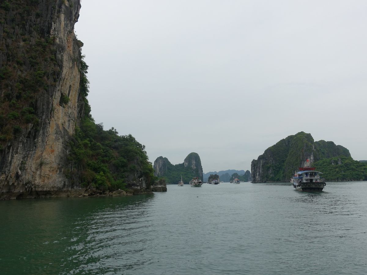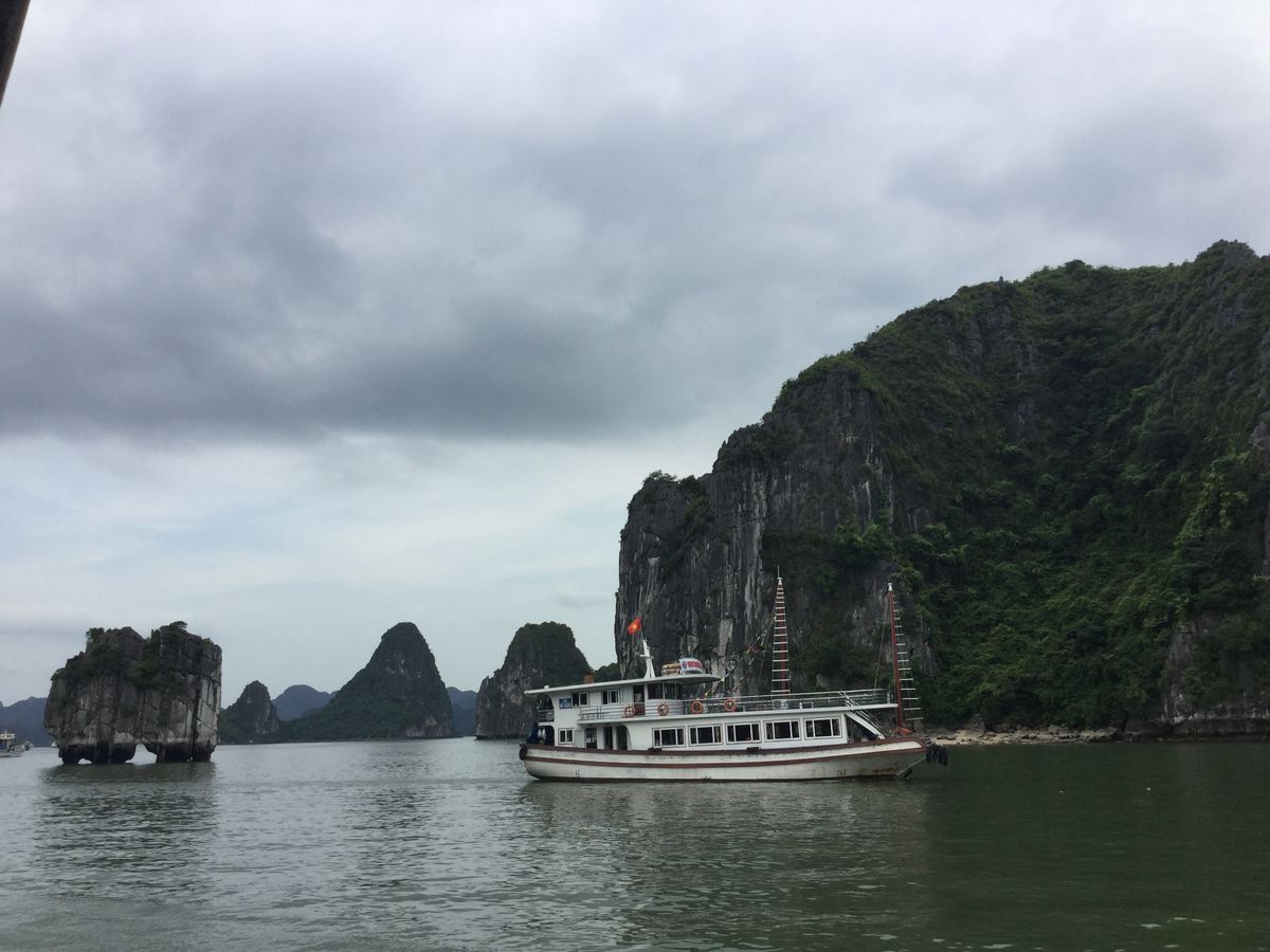念願のハロン湾クルーズは曇り空てしたが桂林の漓江クルーズの水墨画にもよく似ていて、素晴らしい景色でした。雨季ということもあり当日は38℃ほどでしたが船内はエアコンが効かず蒸し暑く、せっかくのシーフード料理も汗タラタラでした。