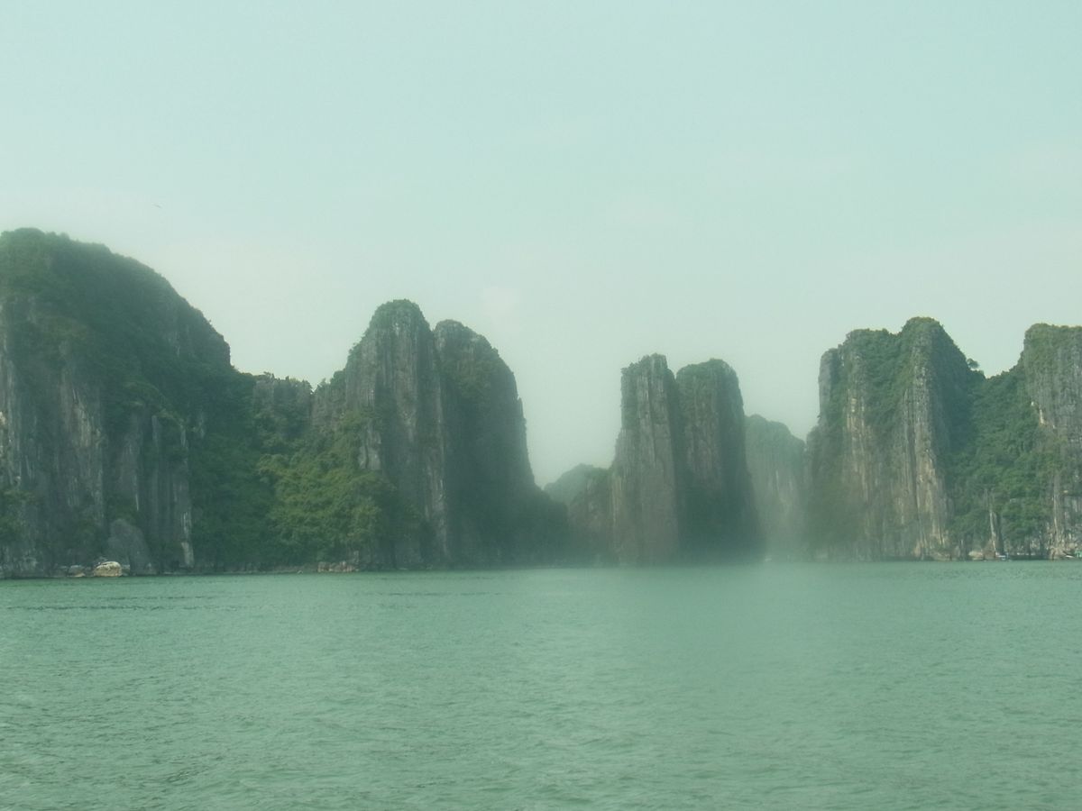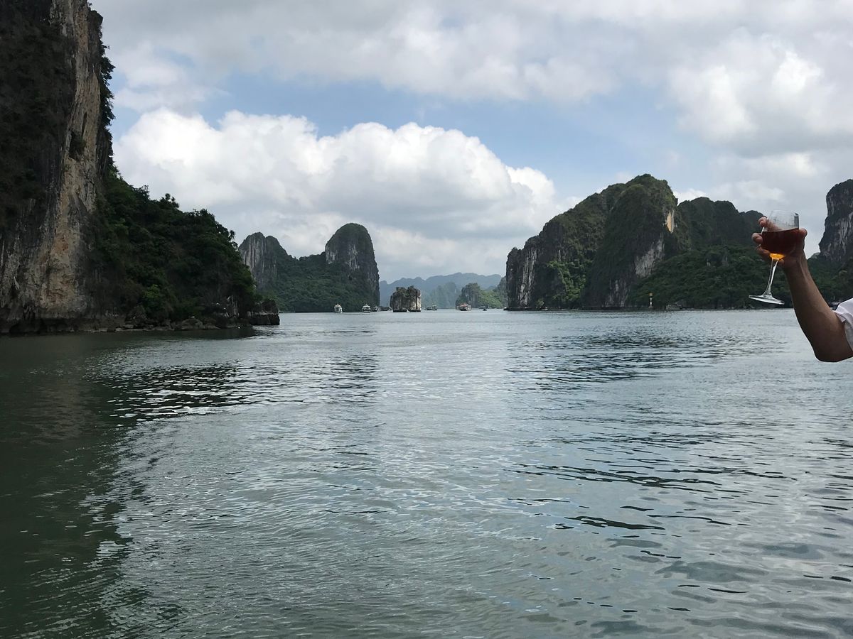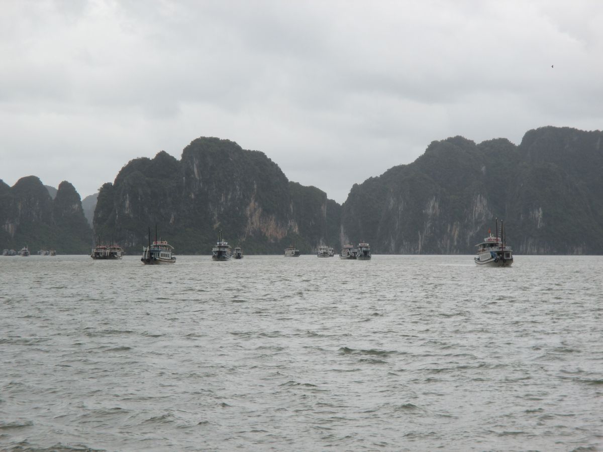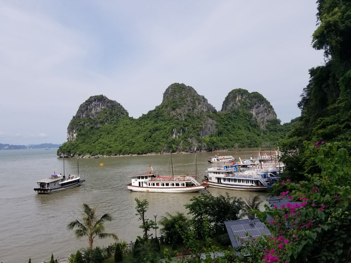 念願のハロン湾クルーズは曇り空てしたが桂林の漓江クルーズの水墨画にもよく似ていて、素晴らしい景色でした。雨季ということもあり当日は38℃ほどでしたが船内はエアコンが効かず蒸し暑く、せっかくのシーフード料理も汗タラタラでした。