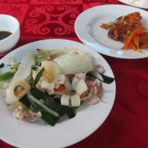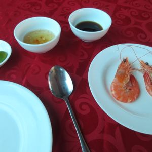 船に乗ってからすぐに食事が出ます。蒸し海老、つくね?の蟹の甲羅詰め、揚げ春巻き、イカと野菜の塩炒め、煮魚(何の魚かは聞けませんでした)ご飯、デザート(バナナ)でした。
