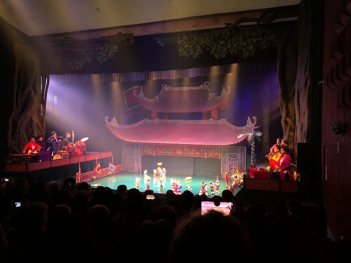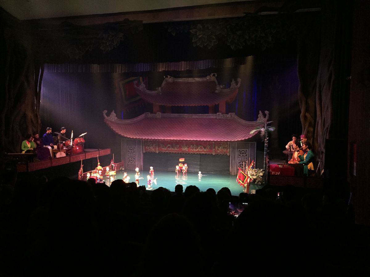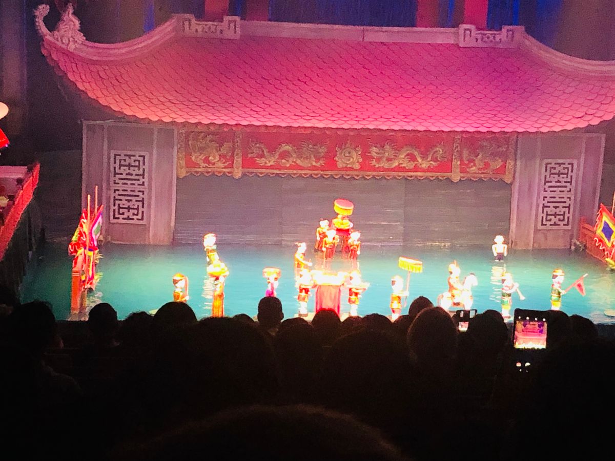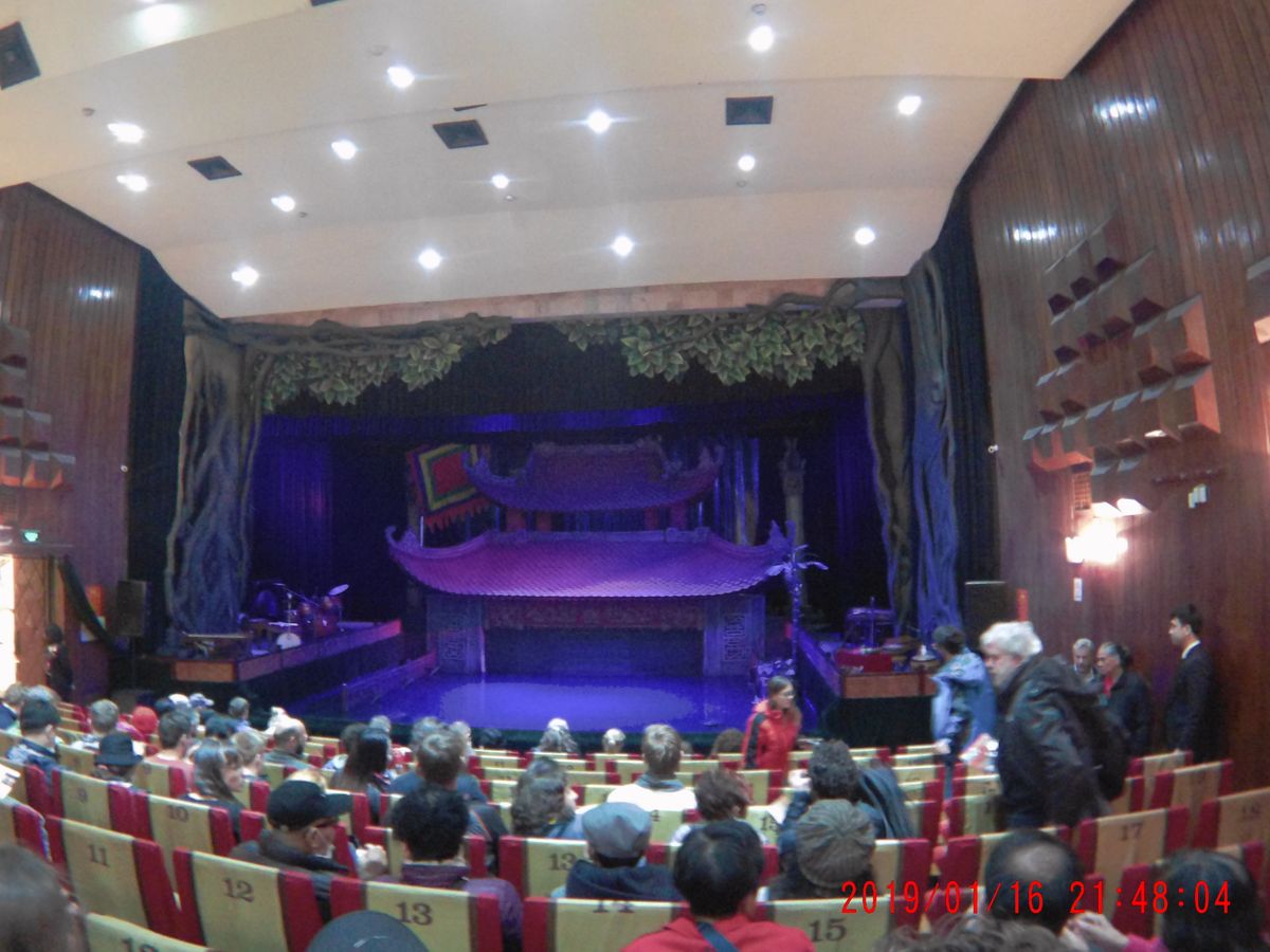 17時半頃の回を見ました。会場はそんなに大きくないので満席でした。欧米の方が多く、上映中うるさかったです。人形劇自体は所々ベトナム語のセリフがあるもののほとんど音楽で物語が出来てるので言葉が分からなくてもなんとなく理解は出来ました。ただ、前もって少しベトナムの生活文化等を調べて行った方がもっとおもしろく感じたかもしれないと後悔してます。その後夜ご飯に行きます。日本語の通じるレストランでコース料理でしたがかなり量が多くて全然食べられなかったです。初めから全部を食べようとすると途中から全く入らなくなってしまったので少しずつ食べれば良かったと思いました。15時頃ハノイに着く便で来たので初日を無駄にせず済んで良かったかな。当日券はほとんど買えないらしいので日本から前もって予約しておいて良かったです。