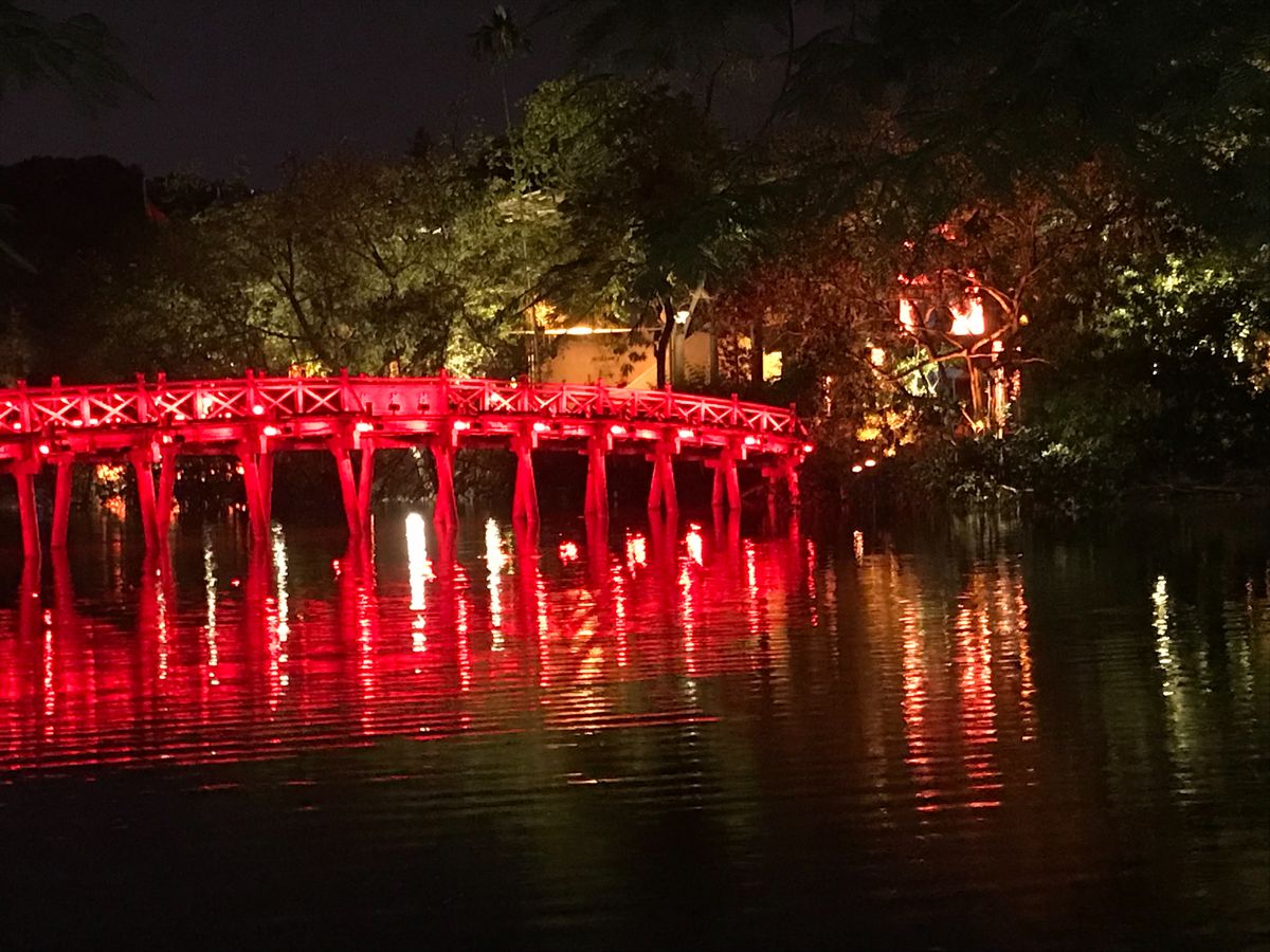 写真はホアンキエム湖の中にある玉山祠にかかる橋です。