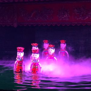 最後は、水上人形劇です。ステージは、17の短編で50分間のコミカルでユーモアラスな親しみのある人形劇でした。伝統楽器の演奏と男女の歌手たちによる歌とセリフをバックに、妖精が舞い、牛が飛び跳ね、龍が昇天し、人が田植えをするなど目まぐるしく場面がかわる。照明、水しぶき、花火などの見せ場も盛りだくさんでした。水上で