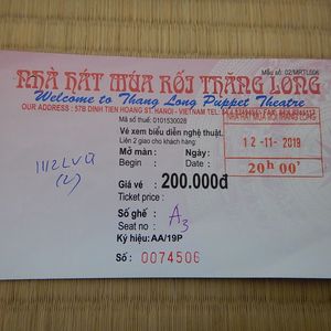 11月12日20時から開演のハノイ水上人形劇鑑賞前列確約プランにしました。10月26日に申し込みました。その日のうちに予約が確定しました。場所はタンロン水上人形劇場でした。Webページには「劇場カウンター前で待機のガイドからお渡し」と書かれていますが、以前に行かれた方の体験談と同じで、前日にホテルのフロントに届いていました。席は最前列の3番と4番でした。正面に向かって左側から1番、2番となっていて、1列に15席くらいありました。やや斜めでしたが、はっきり観ることができました。席は映画館のように段々になっていますが、できるだけ前の席の方が良いと思います。チケットは20万ドン(約1,000円)でこのプランで約2,000円ですが、チケット購入の手間が省けますし、前列確約なので、このプランはとても良いと思います。劇は短い物語がいくつもあって、劇場に日本語演目のカードもありますので、何を踊っているのかなんとなくわかりました。全体で約1時間程度です。とても良かったです。水上人形劇はおすすめですし、前列確約プランをおすすめします。