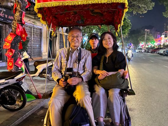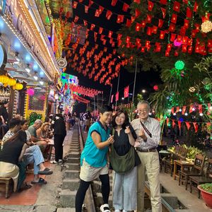 最初から最後まで私たち夫婦2人だけのツアーは、贅沢で落ち着けて、ガイドさんもハノイの景色も1人いや2人じめでした。まず始めに訪れたのは、チャーカー料理の店。さすがミシュランを取ってるだけあり、料理も店の雰囲気も客層も良かったです。全くナマズ臭さがなくて上品な味。なにより、ガイドのザンさんが、テーブルで調理?までしてくれて、食べ方も教えてくれて、なんと関係ない隣の人たちにも教えていました笑。次は待ちに待ったトレインストリートへ。線路ギリギリに置かれたテーブル席で、エッグコーヒーとソルトコーヒー(料金込み)を飲みながら、列車がスレスレに通るのを見るのはドキドキわくわくします。2回、短いのと長い列車の通過を見れました。その後、シクロ体験。15分は乗ってたと思います。11月の下旬の夜風は冷んやりと心地よく、少し上から見る問屋街や夜市は楽しかったです。シクロの脇をビュービュー通っていくバイクや車にスリルを味わえます。降りた後は、ナイトマーケットを散策。初めてのベトナムに慣れない私たちをガイドのザンさんは安全に連れてってくれました。ザンさん、最高です!ありがとうございました。一番の旅の思い出になりそうです。